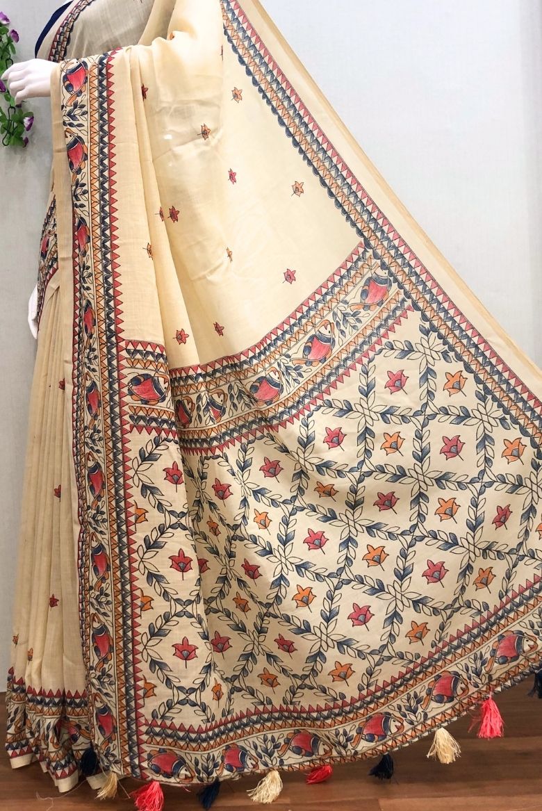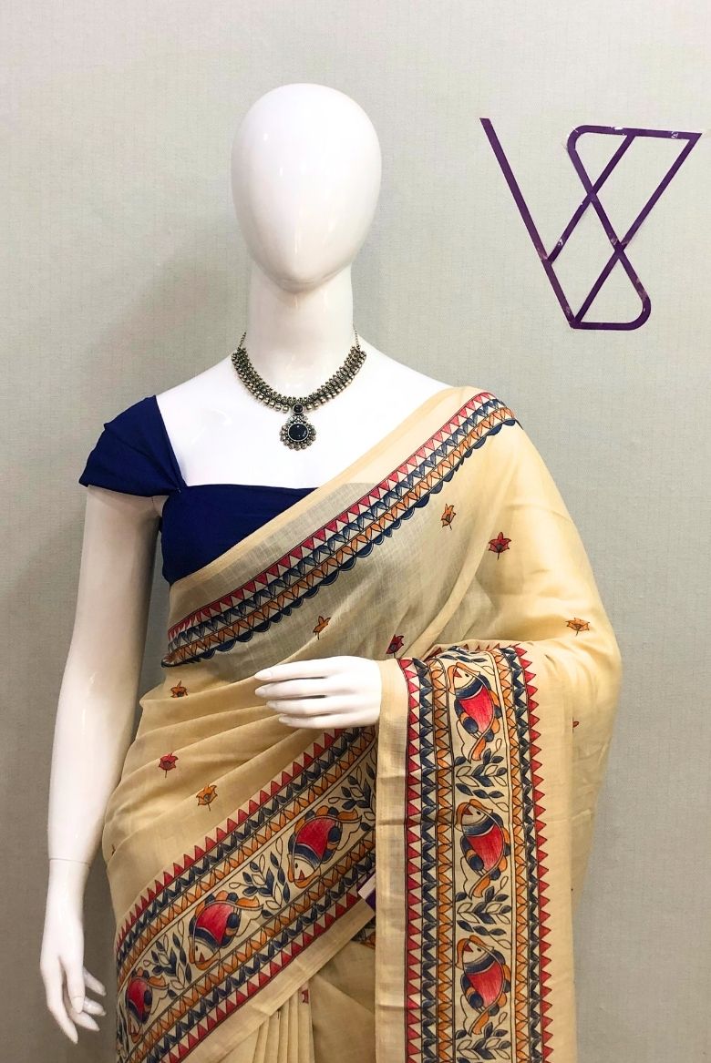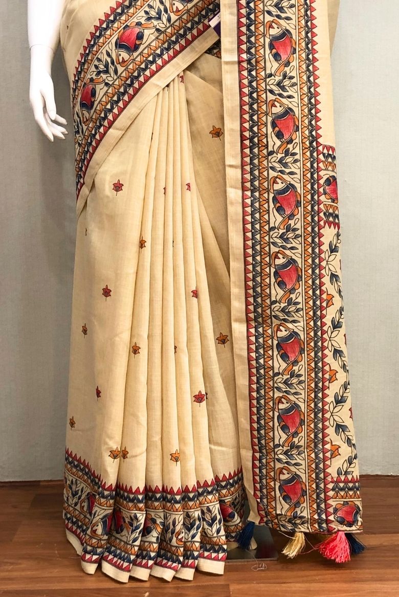 This saree features traditional prints such as fish, geometrical shapes along the border and small flower motifs across the body. The border has a vibrant pattern in red, mustard, and blue tones.