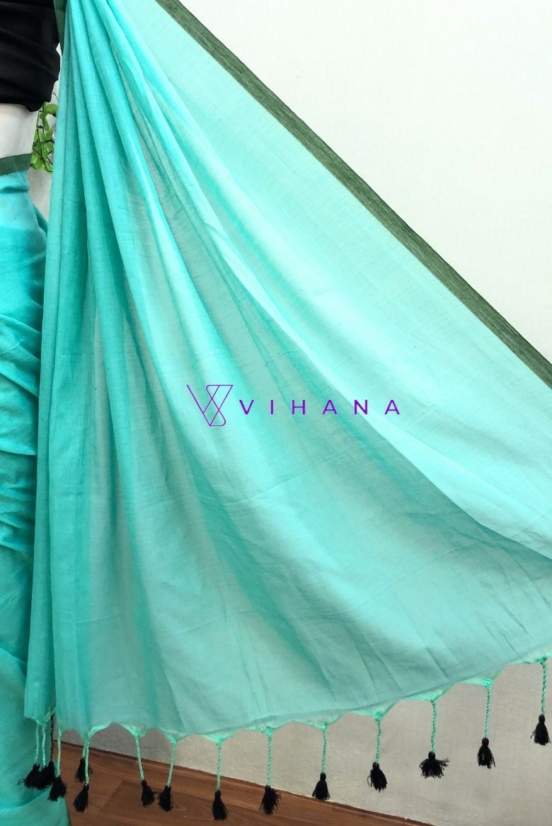 The primary color of the saree is a Sea Green. It features a thin, green border along the edges and on the pallu, beautiful tassels are attatched.