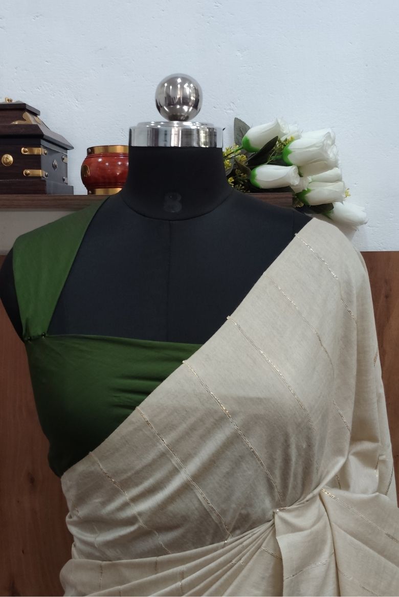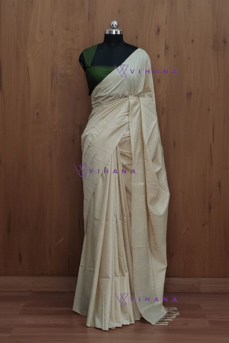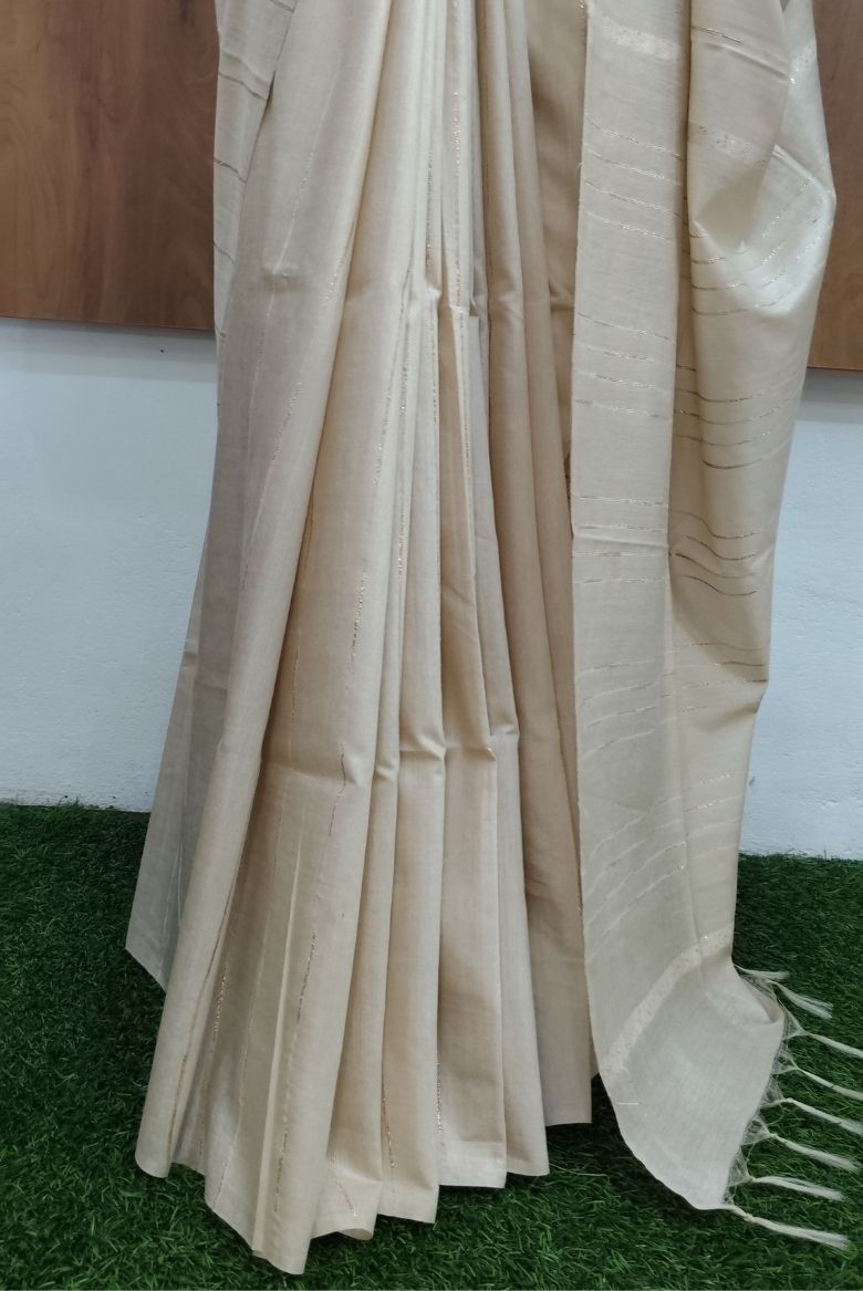 This Beige coloured saree features fine, subtle gold or silver stripes woven throughout the fabric, adding a touch of elegance.