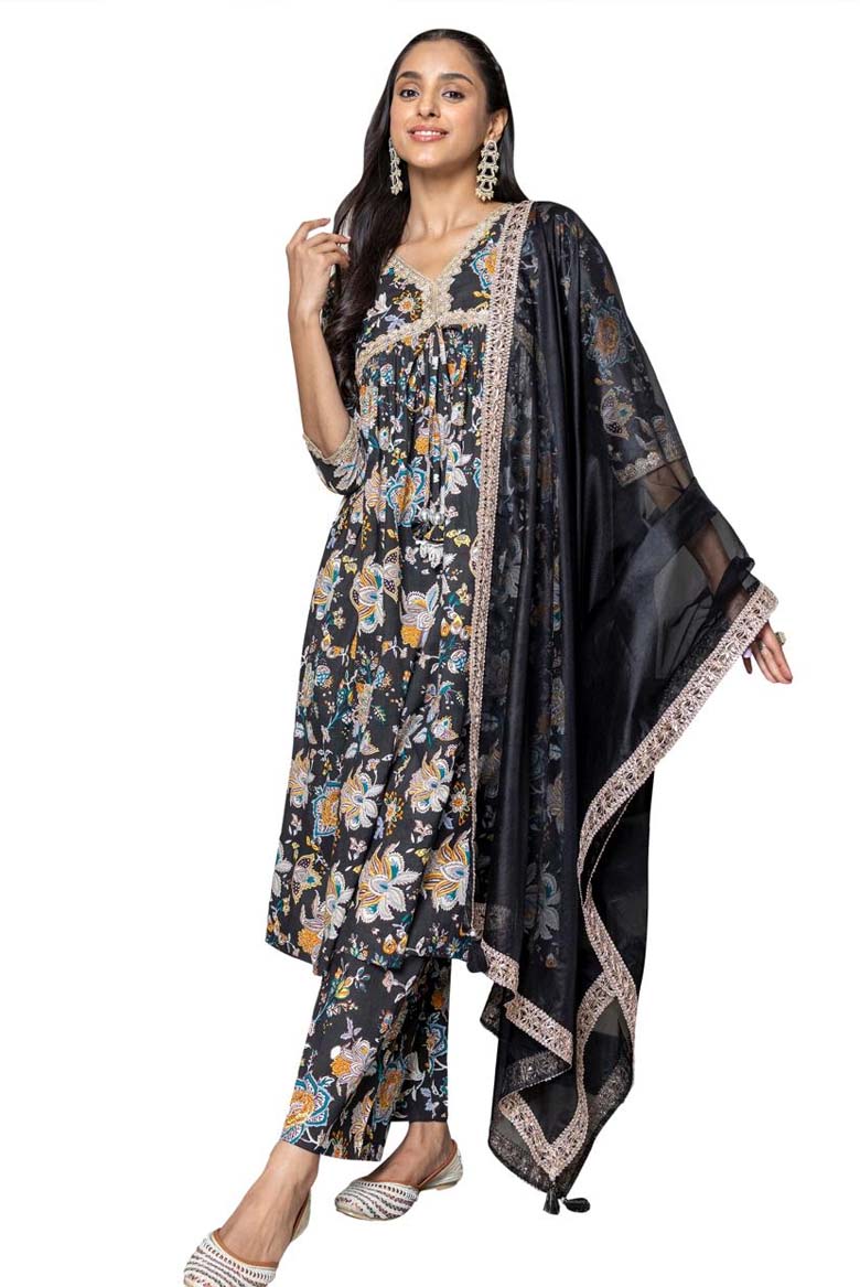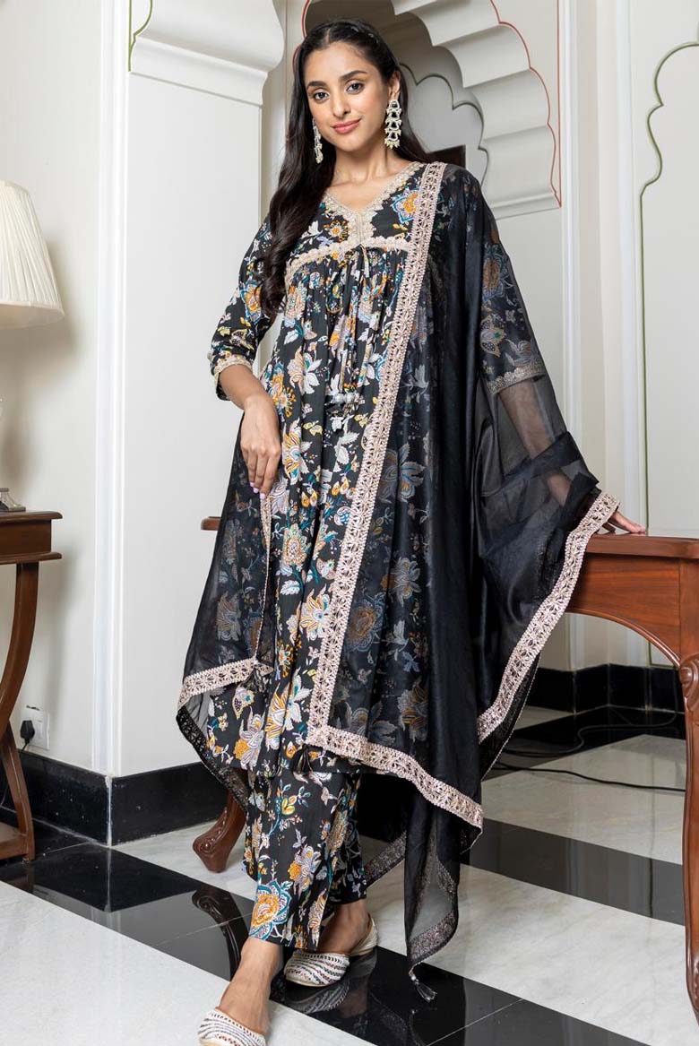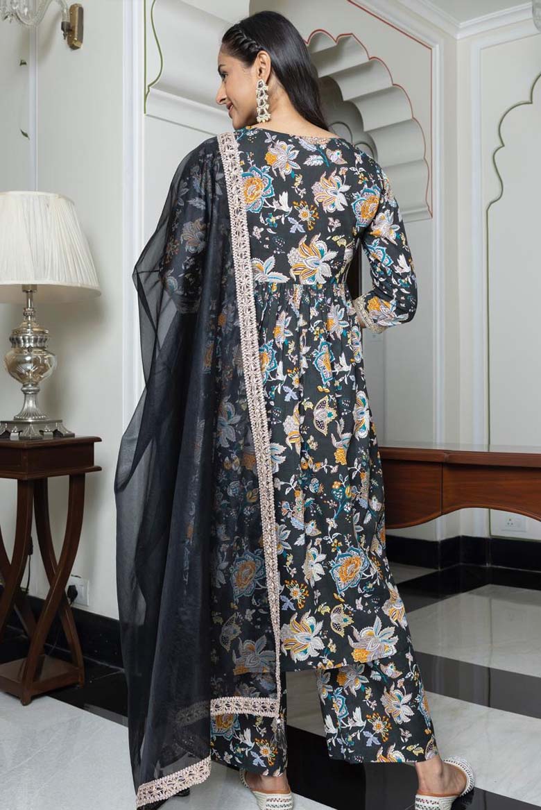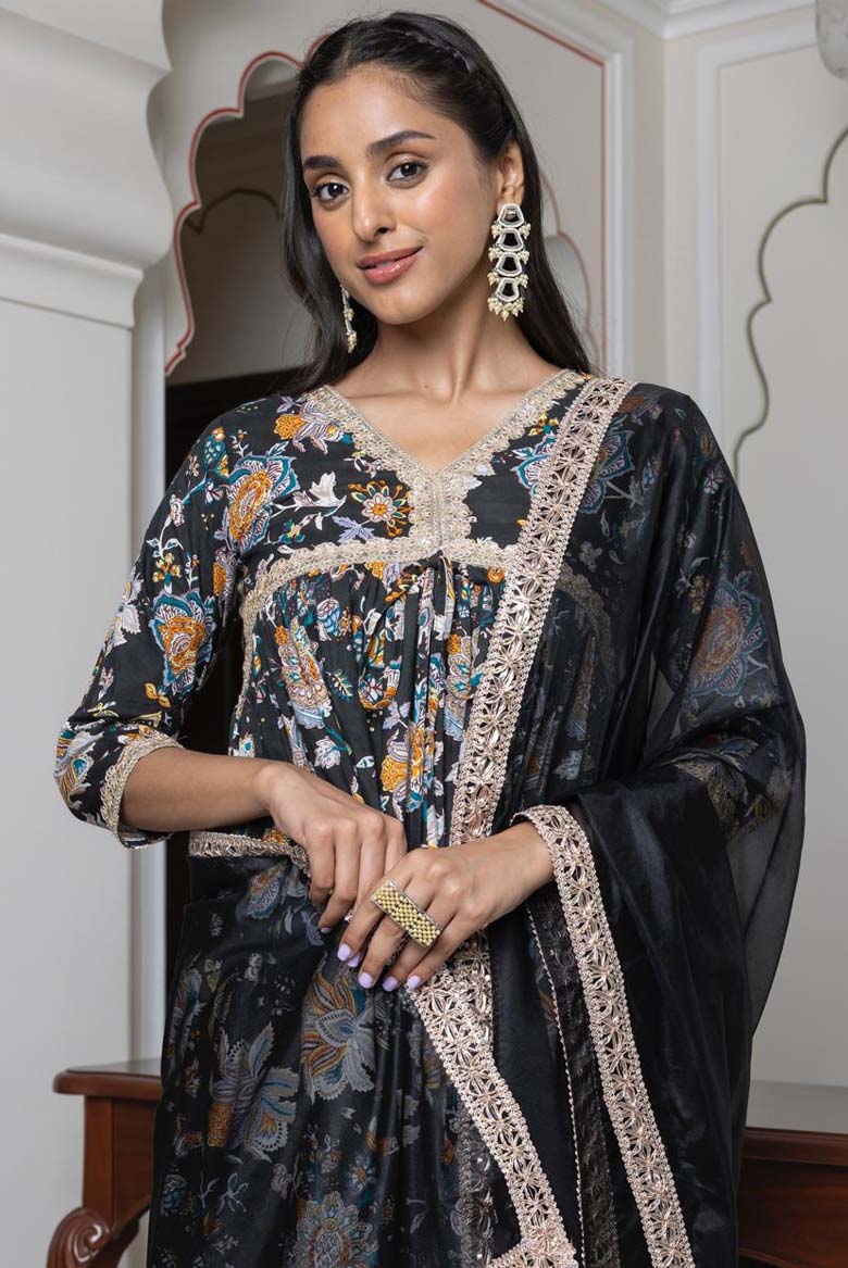 Black Cotton Embellished Kurta with Palazzo and Dupatta is the perfect ensemble for those seeking sophistication and grace during festive occasions. Crafted from the finest black cotton fabric, this outfit features intricate embellishments on the yoke and sleeve hem, creating a captivating visual appeal. The kurta set is beautifully detailed with floral prints, laces, tassels, pompoms, beads, and stones. The kurta boasts an empire waist and 3/4th sleeves, and a round neck. The matching palazzo, made from the same black cotton fabric, ensures a coordinated look. It features a fully elasticated waist and a drawstring for ultimate comfort and adjustability. Completing the ensemble is the black organza dupatta.
