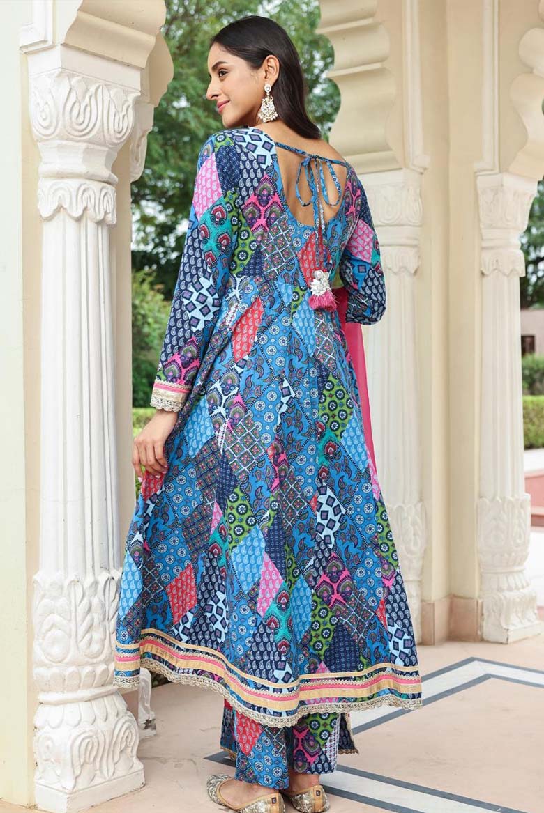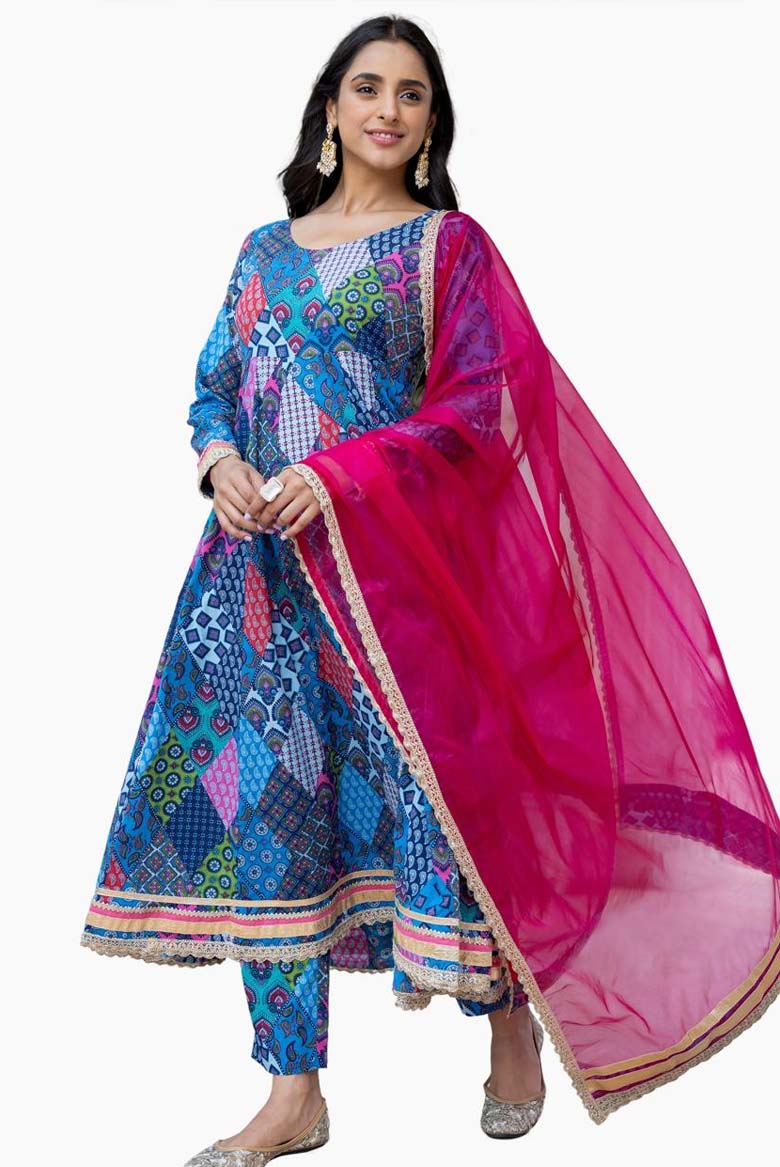 Choose this Blue Cotton Ethnic Printed Kurta Set. This stunning ensemble includes a beautifully crafted Anarkali style kurta, a comfortable pair of pants, and a coordinating dupatta. Crafted from high quality cotton fabric, this kurta is designed to provide both style and comfort. The intricate ethnic print adds a touch of elegance to your festive look. Its full sleeves and regular round neck make it perfect for traditional occasions. With a calf length design, this kurta strikes the ideal balance between tradition and modernity. To maintain the pristine appearance of this outfit, we recommend dry cleaning only. Embrace the festive spirit and make a fashion statement with this Ethnic Printed Kurta Set in radiant blue.