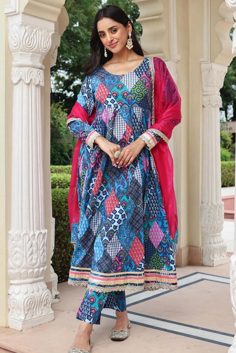 Blue Cotton Ethnic Printed Kurta With Pant And Dupatta
