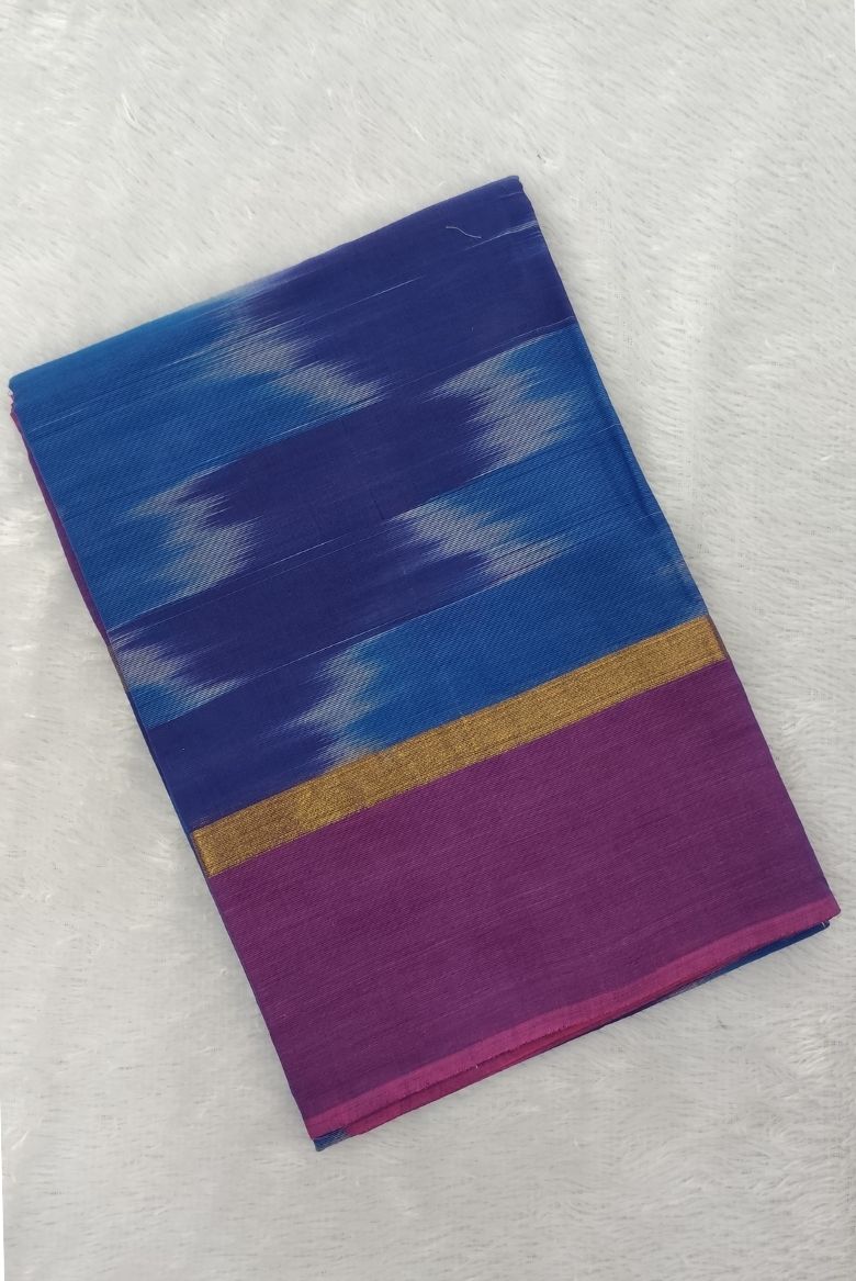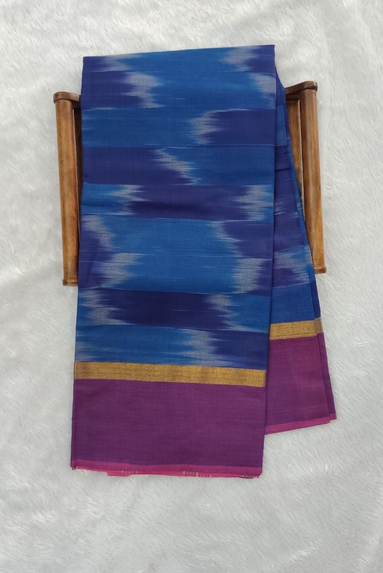 This saree featuring ikat weaving technique, pallu and border have prominent horizontal stripes in magenta & gold hues.