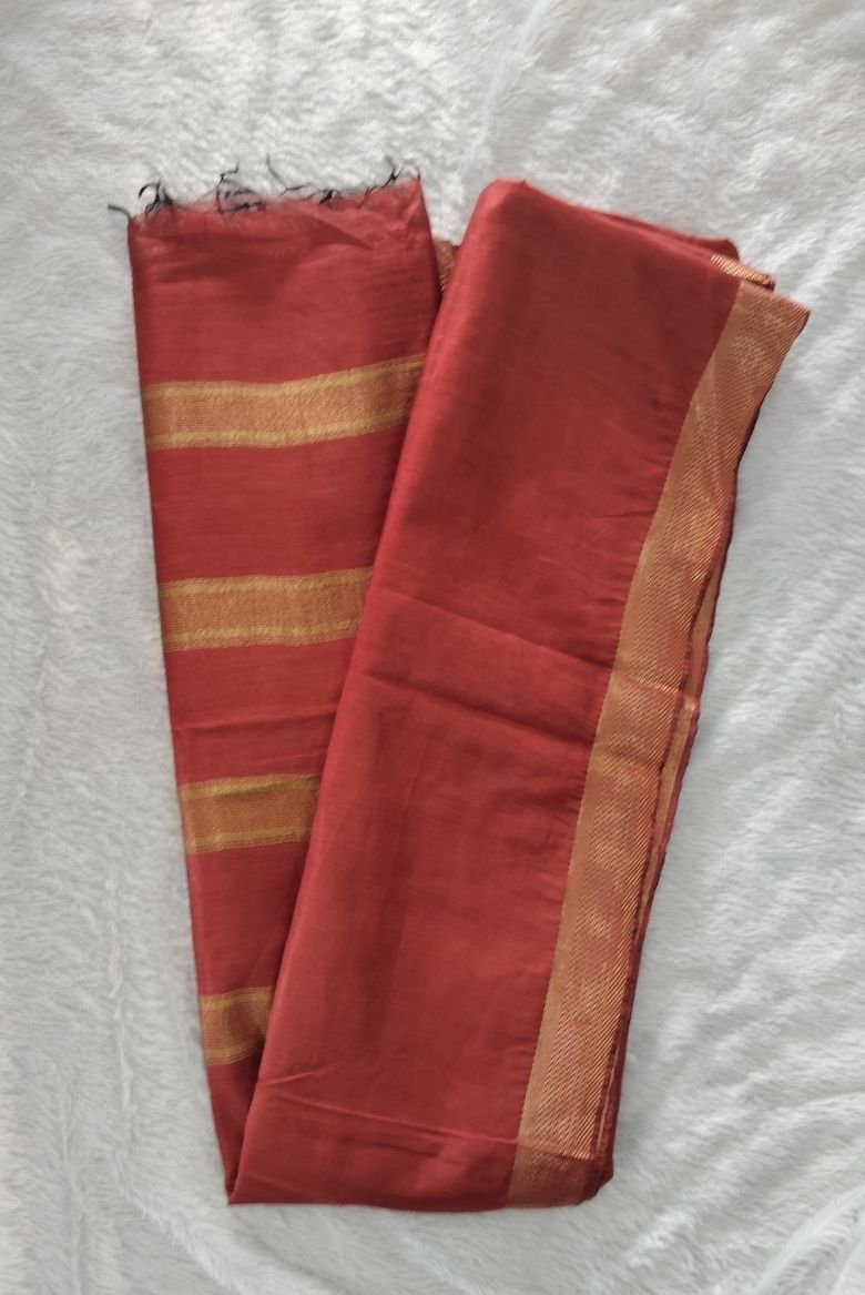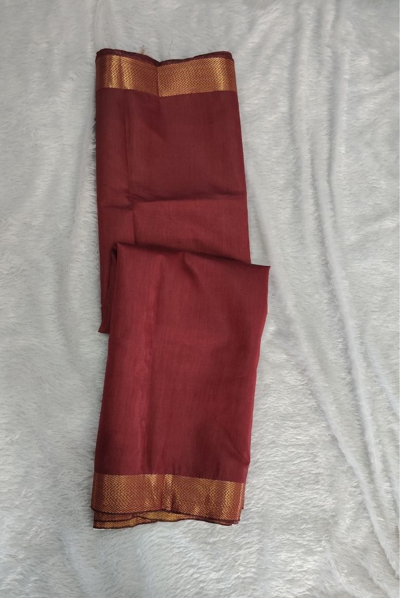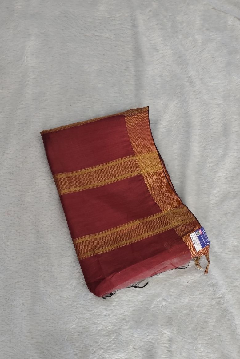 This saree features a rich brown body with a prominent wide golden zari border . The Pallu is highlighted with that same Golden zari stripe designs.