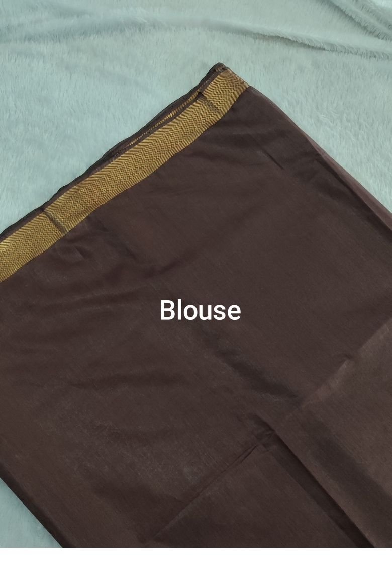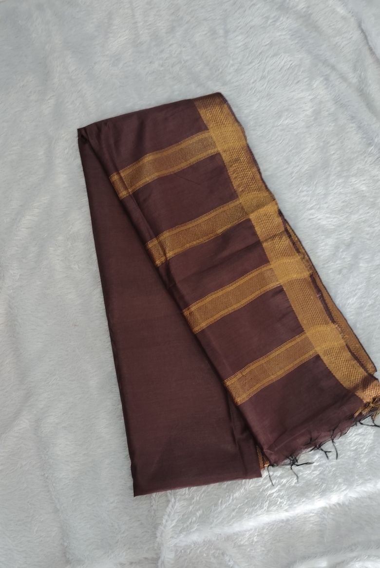 This saree features a rich brown body with a prominent wide golden zari border . The Pallu is highlighted with that same Golden zari stripe designs.