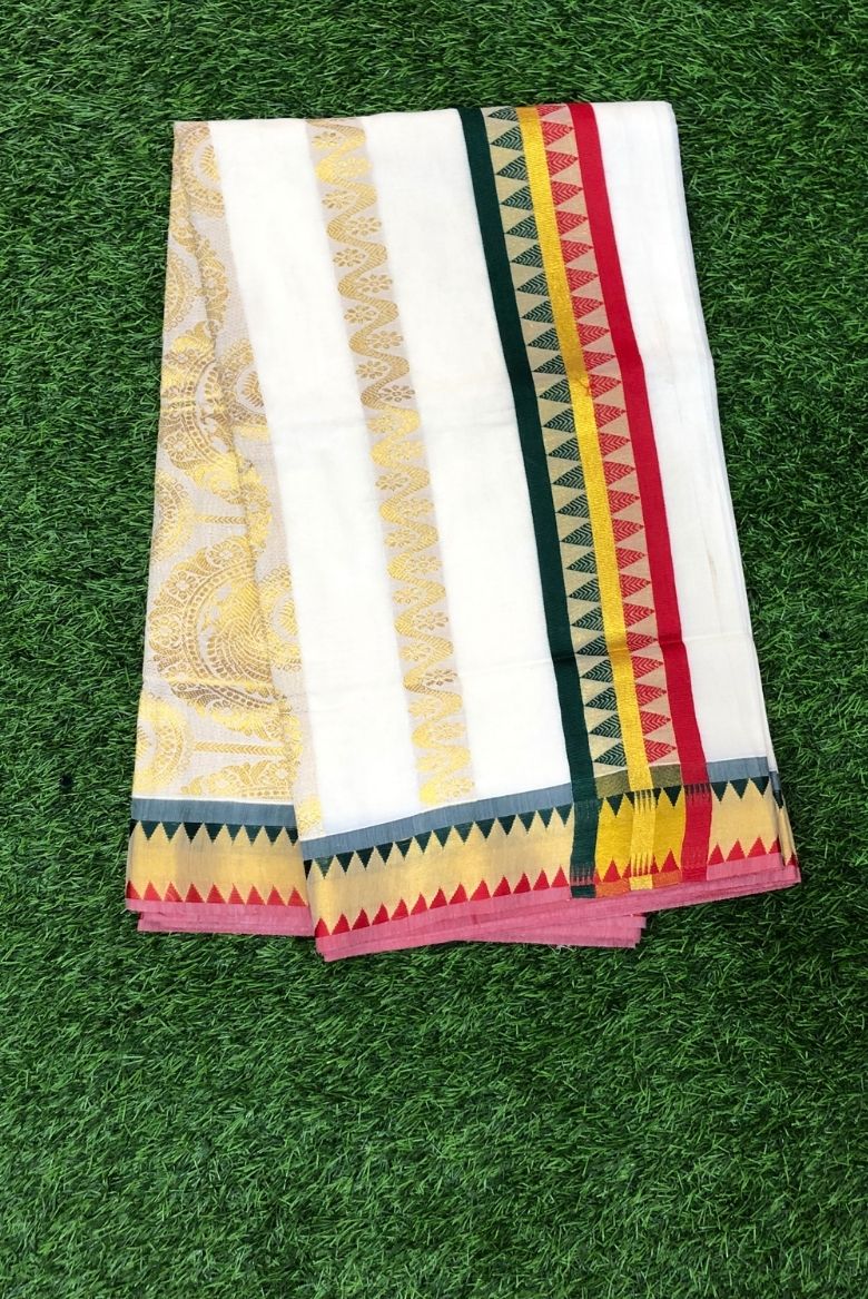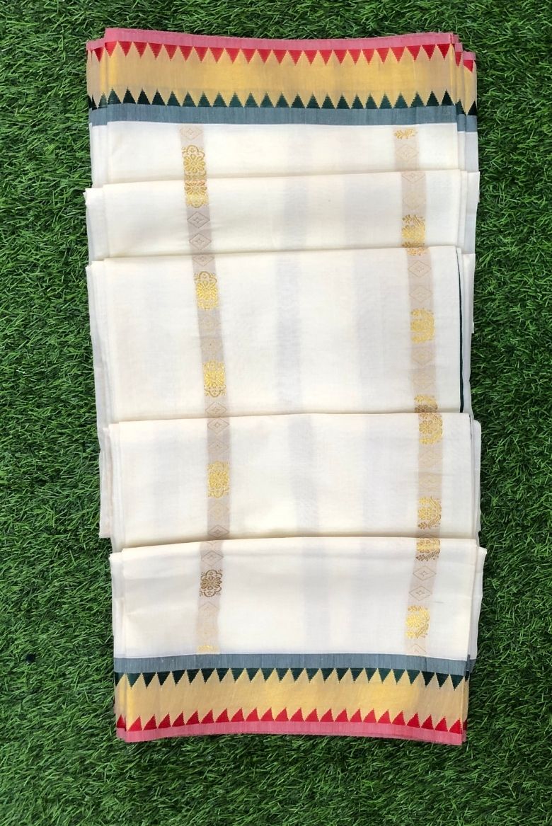 Classic Kerala Kasavu Set Saree with Multicolour Temple Border