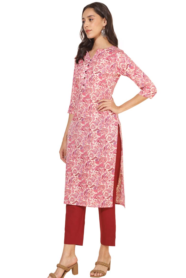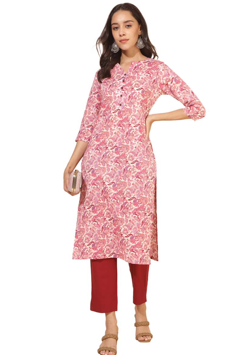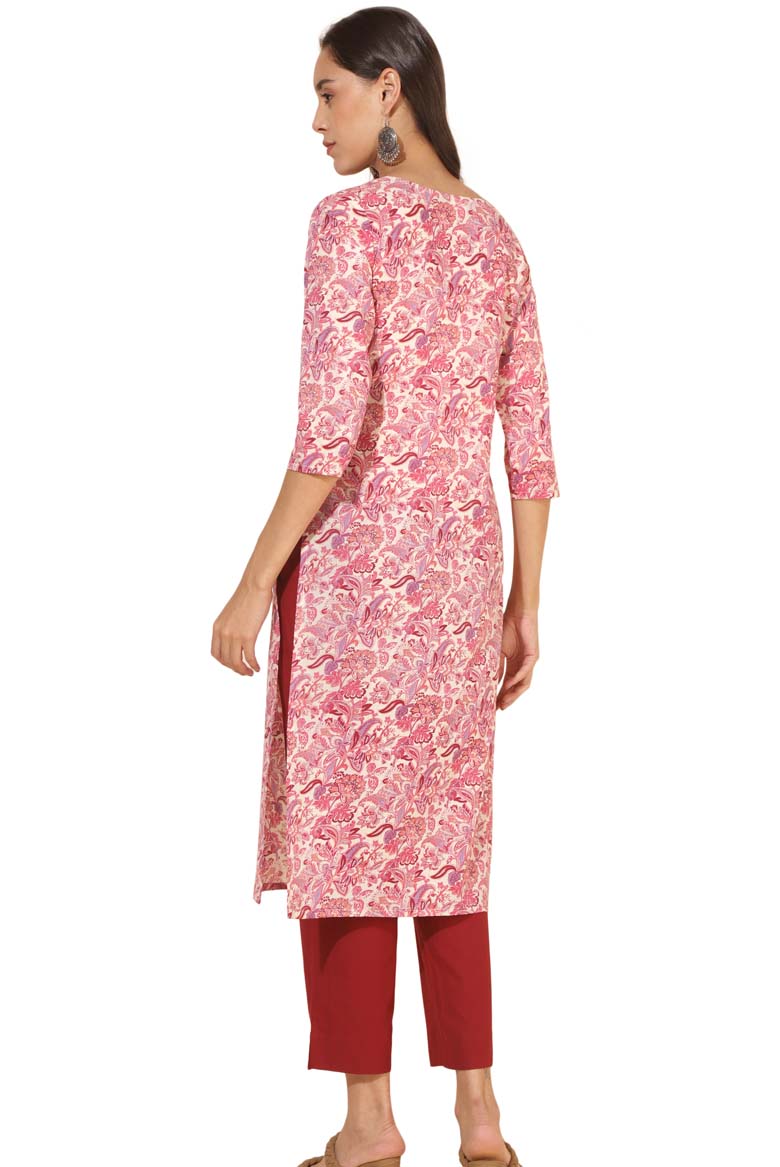Cream Cotton Regular Kurta with pink color floral print
