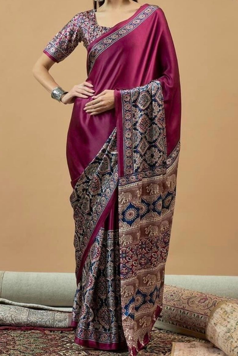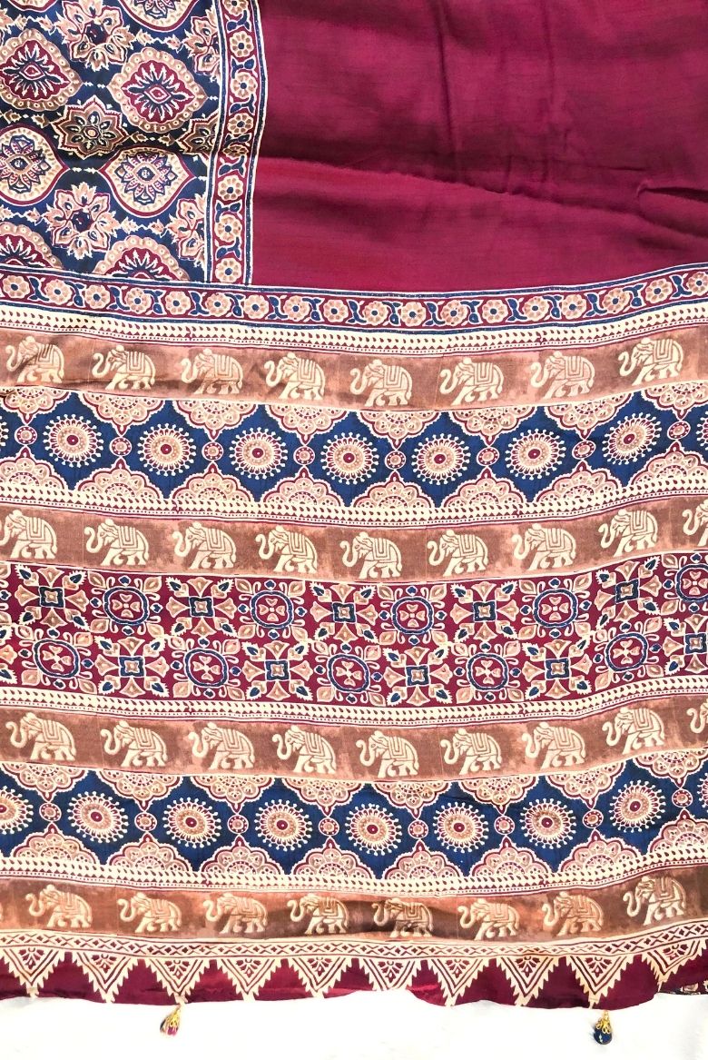 Dark Wine Modal Satin Silk Saree with Traditional Ajrakh Print