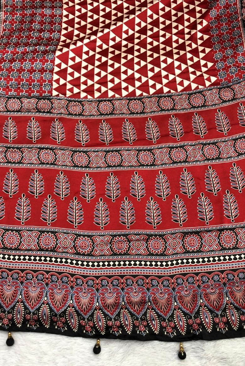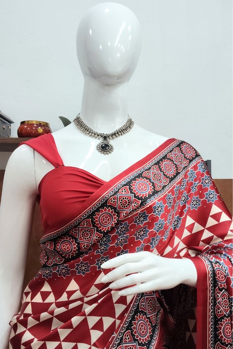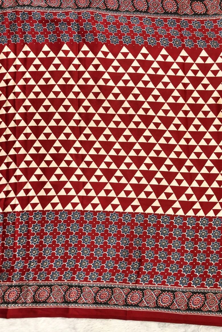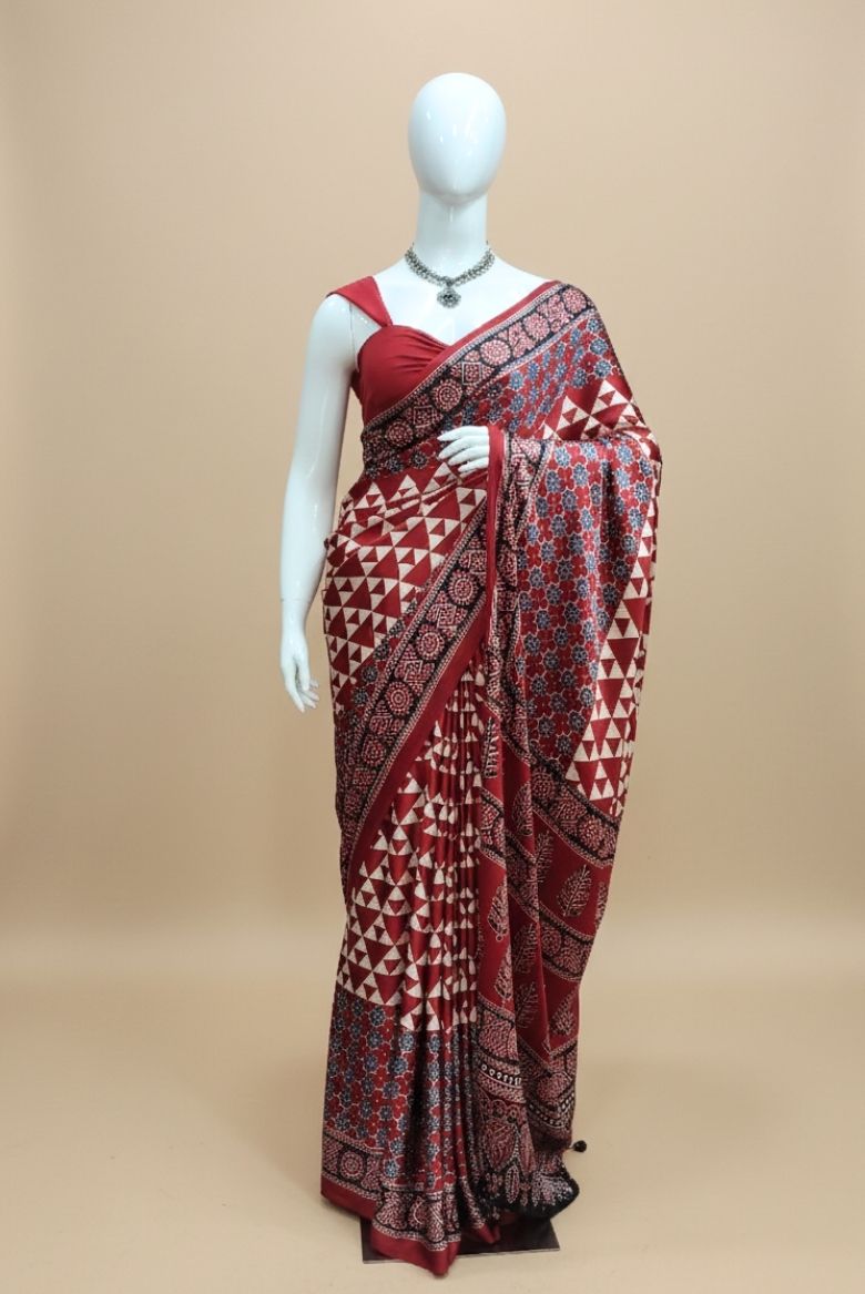 Deep Red Ajrakh Printed Premium Modal Silk Saree