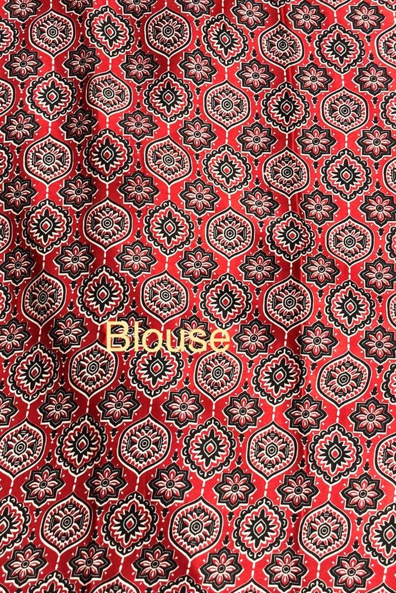 The saree features intricate traditional Ajrakh artistry, showcasing a blend of geometric patterns and floral motifs in red, white, black, and blue hues. The pallu (draping end) often highlights delicate work, intricate designs, and a contrasting border that lends definition and grace to the overall look.