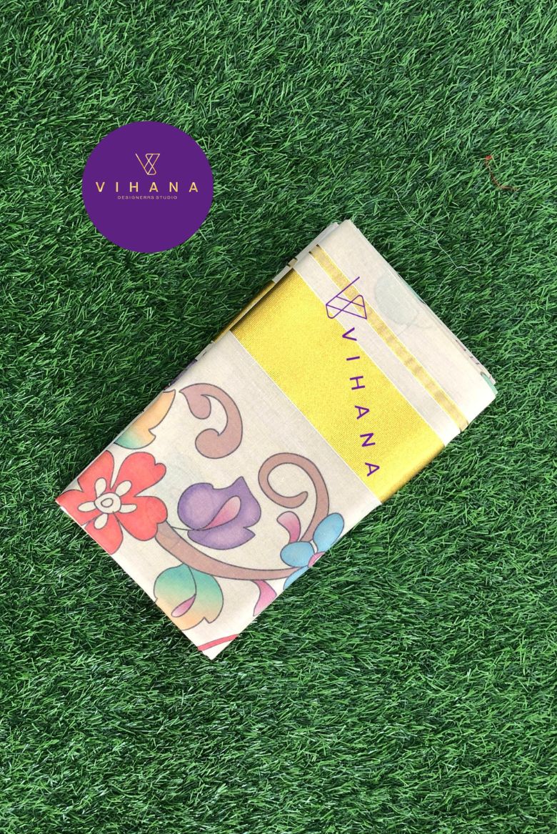 This elegant set saree features a cream or off-white base with a vibrant, multi-colored floral digital print design. It includes a prominent, soft gold zari border and pallu. The intricate floral and vine pattern incorporates various colors such as blue, red, purple, and green, providing a rich and detailed look.