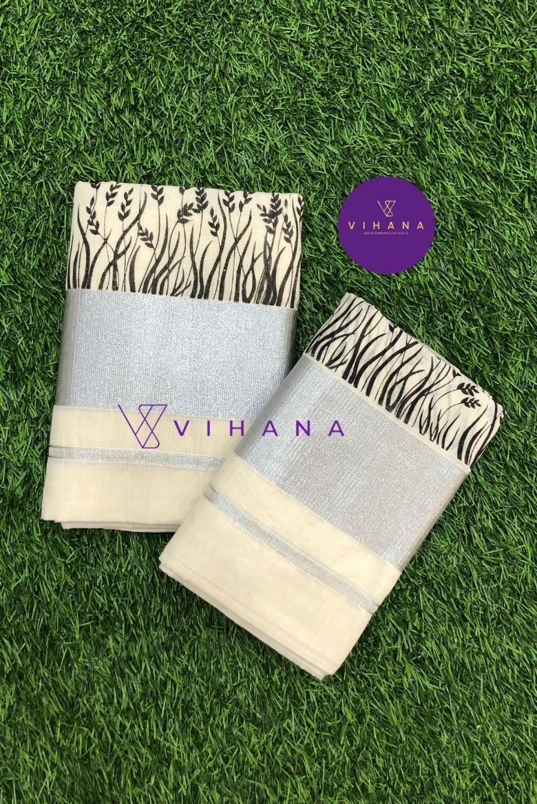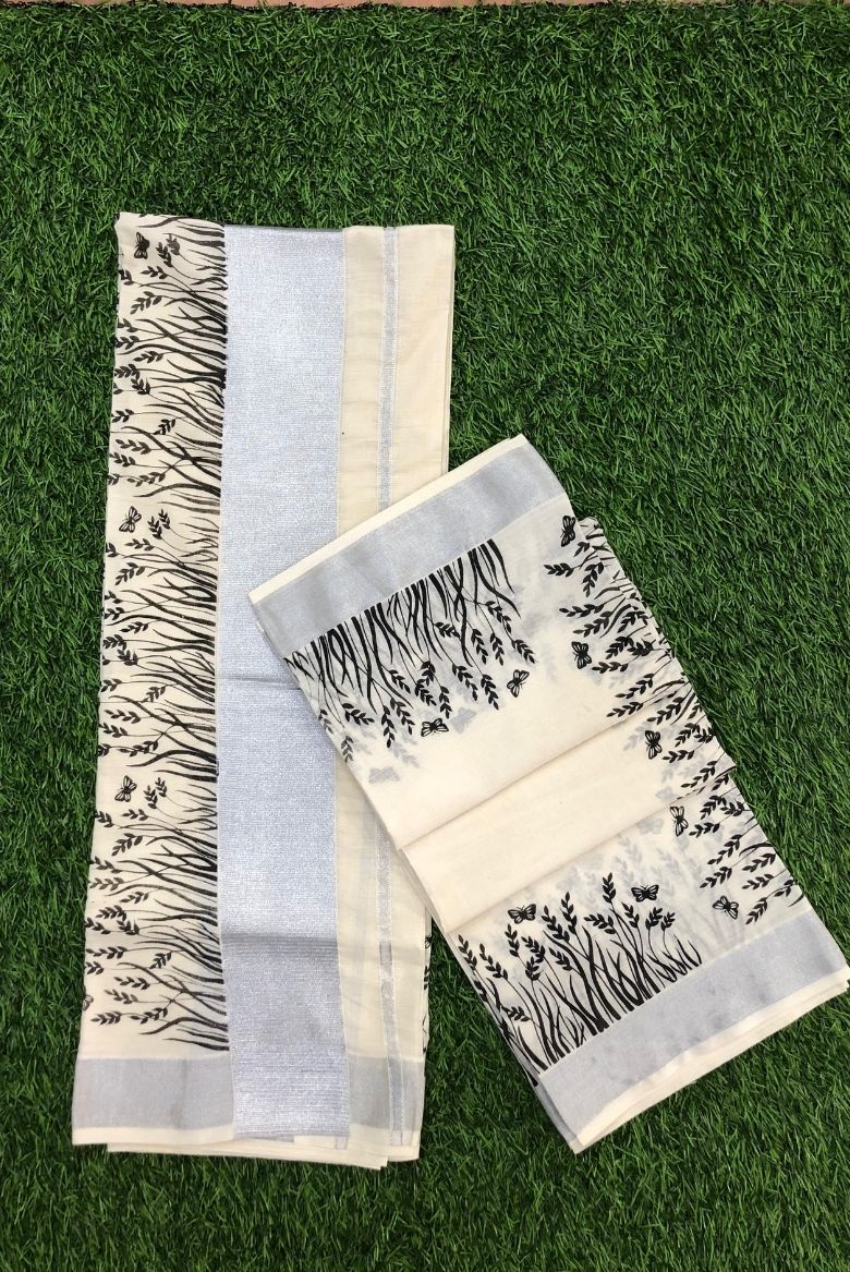 This set mundu delicate leaf printed patterns, silver border and silver zari kasavu edge.