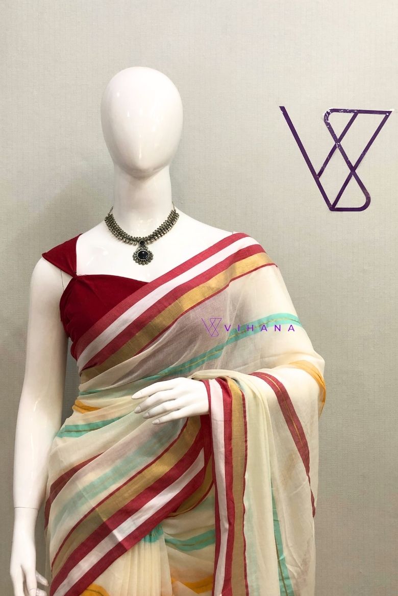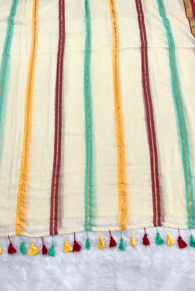 Elegant Cream Pure 120 count Mul Cotton Saree with Vibrant Borders and Hand-knotted Tassels.