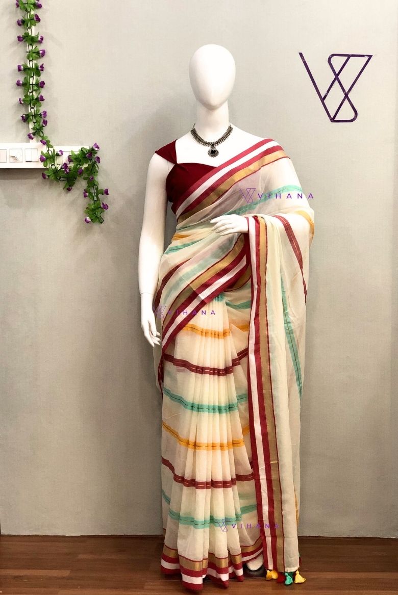 The saree is a serene half-white or light cream shade, accentuated by a striking border featuring a mix of green/teal, deep red, and radiant golden zari threads.Hand-knotted tassels in red, green, and yellow provide a distinctive, artisanal finish to the pallu.