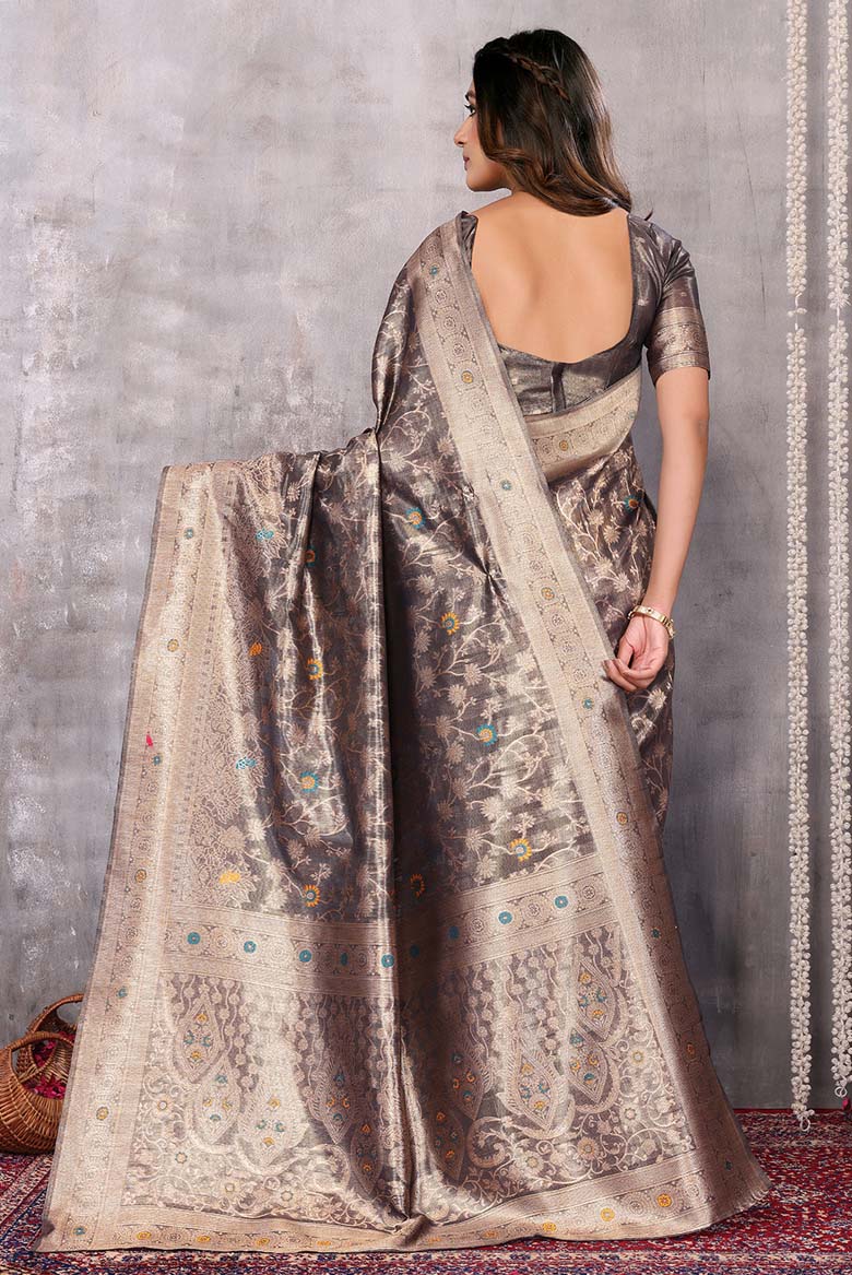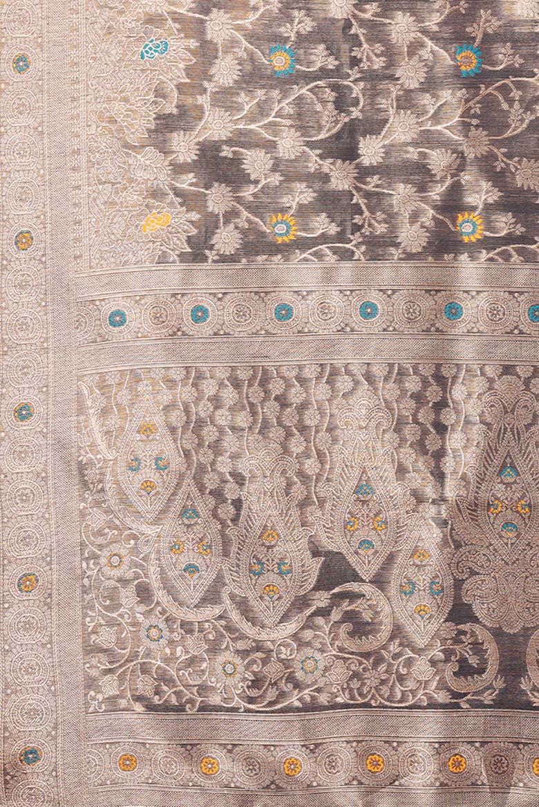 Linen-cotton blend saree with a 3D digital print, comes with an unstitched running blouse piece. (Color-Grey)
