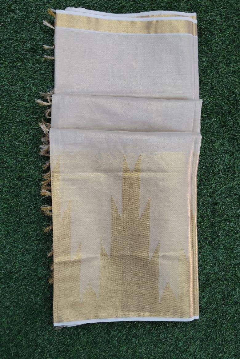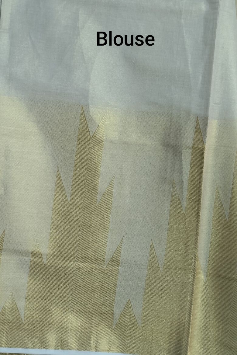 This graceful tissue set saree showcases a soft ivory base enhanced with a subtle golden sheen, giving it an elegant and festive appeal. The highlight of the saree is its classic temple print border, woven in rich gold tones, inspired by traditional South Indian temple motifs.