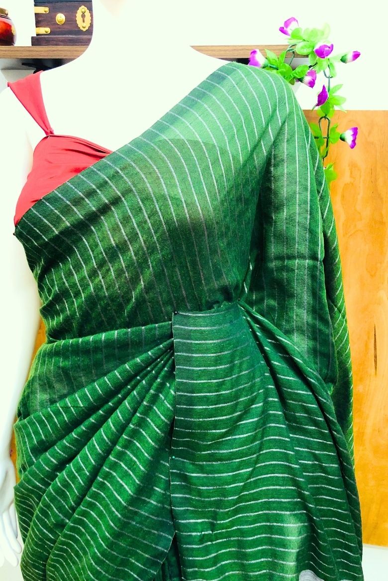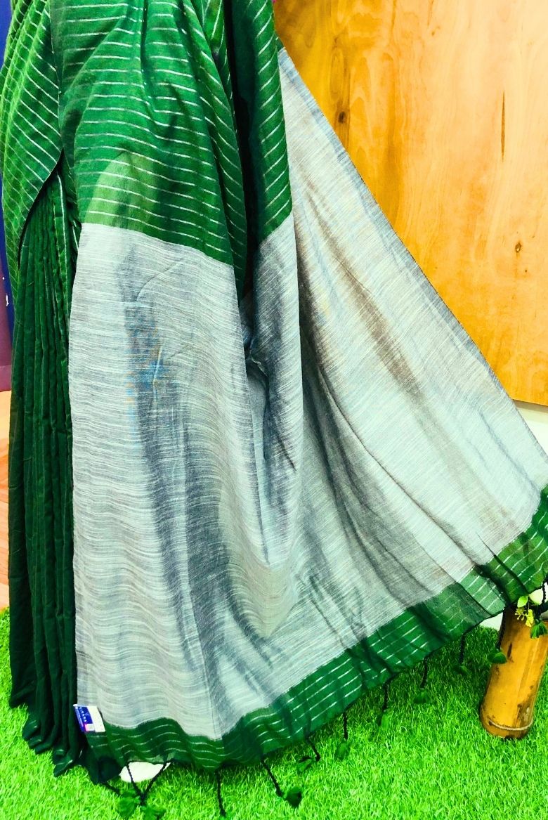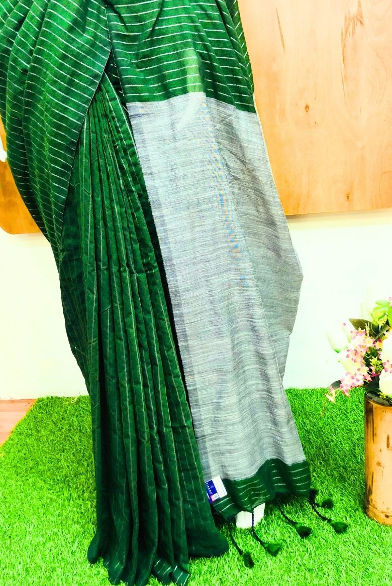 Green Silver Zari Striped Khadi Cotton Saree