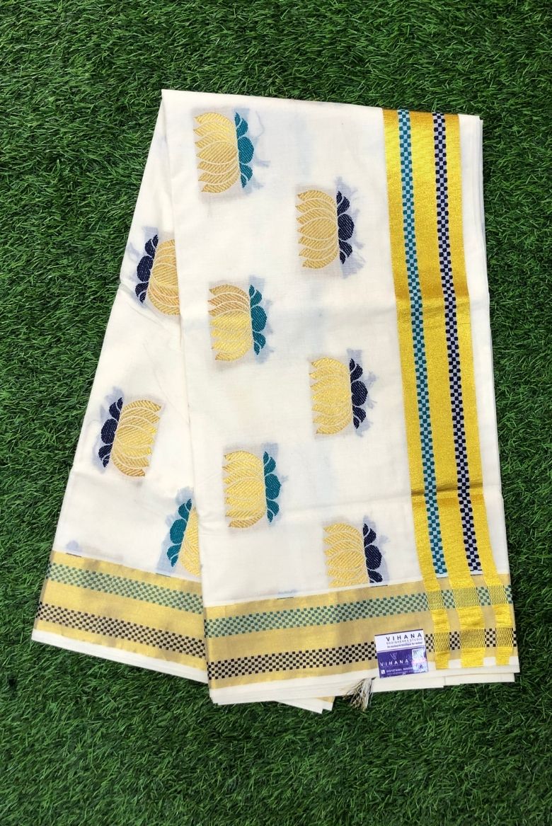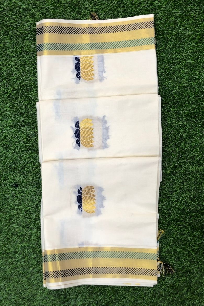 Handloom Kerala Cotton Lotus Jacquard Weaving Set Saree
