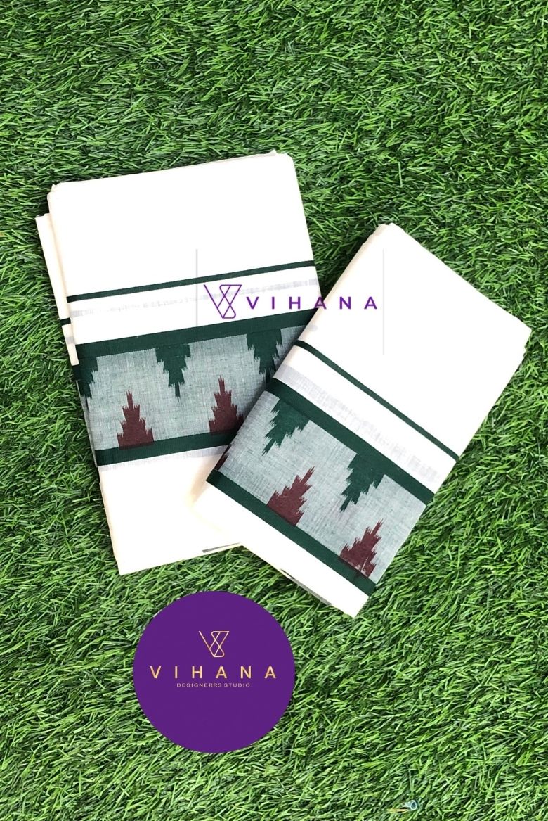 This classic cotton set mundu is a beautiful blend of simplicity and tradition. Crafted from soft, breathable cotton. It features a pristine off-white base highlighted by a refined grey and deep green ikat border.