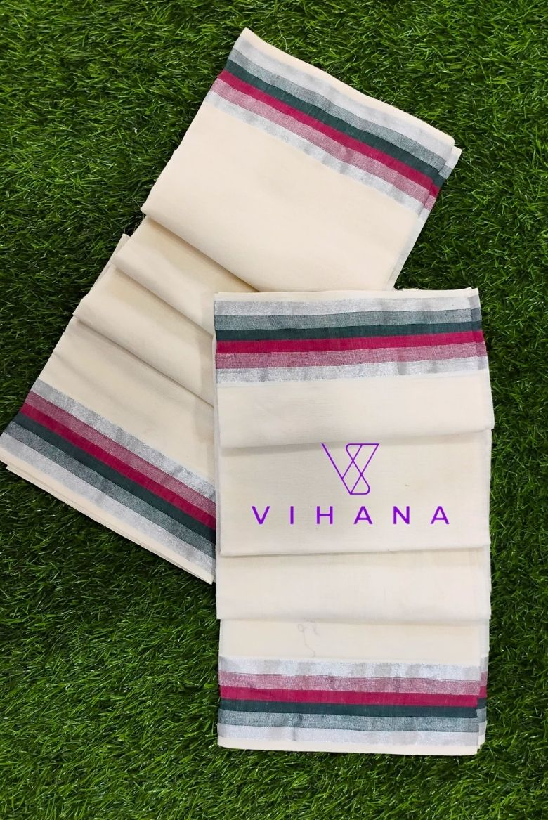 Kerala Cotton Set mundu with Maroon and Green Borders