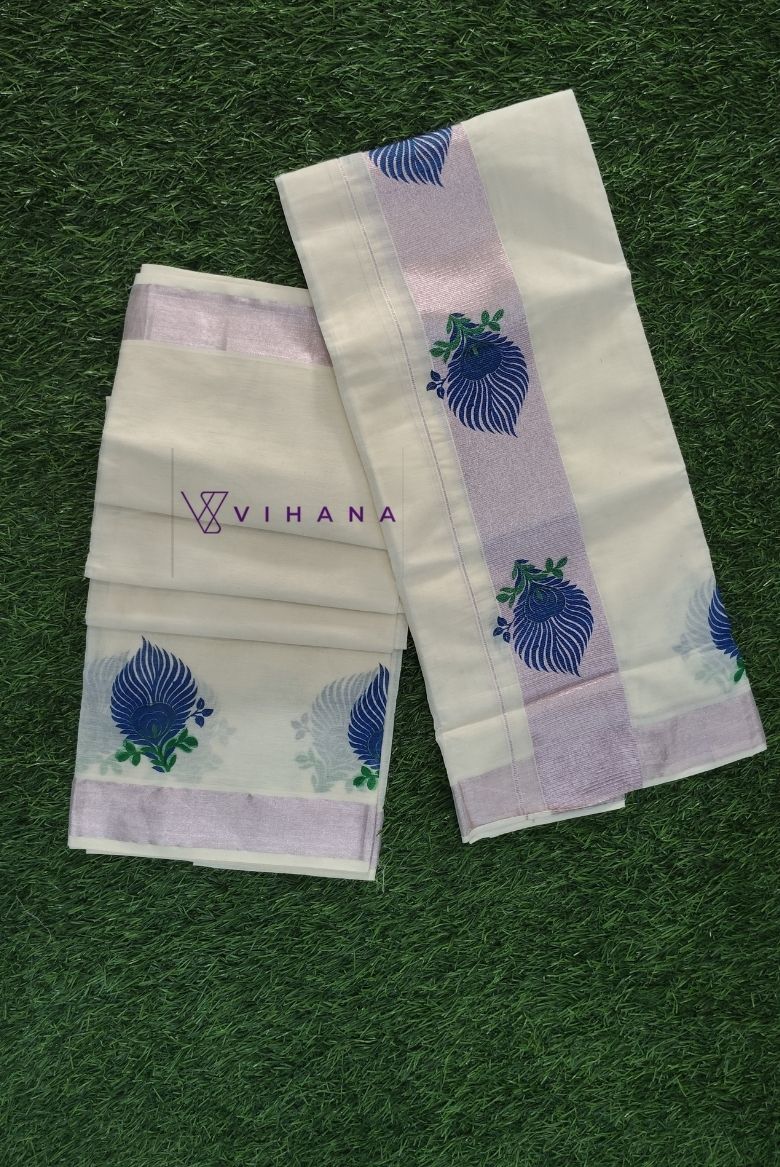 This elegant set mundu features a subtle rose gold zari border that adds a refined touch of tradition. The highlight of this piece is the beautifully printed blue peacock feather motif with delicate green detailing, placed artistically along the border for a striking yet graceful look.