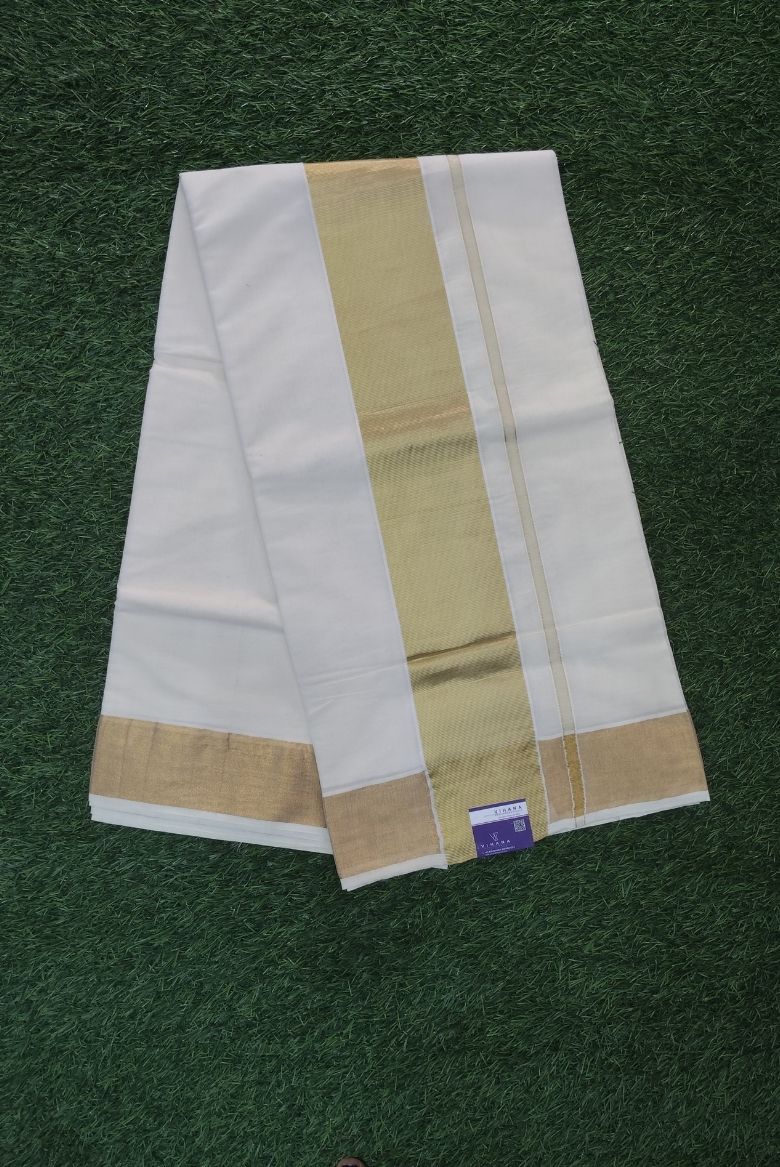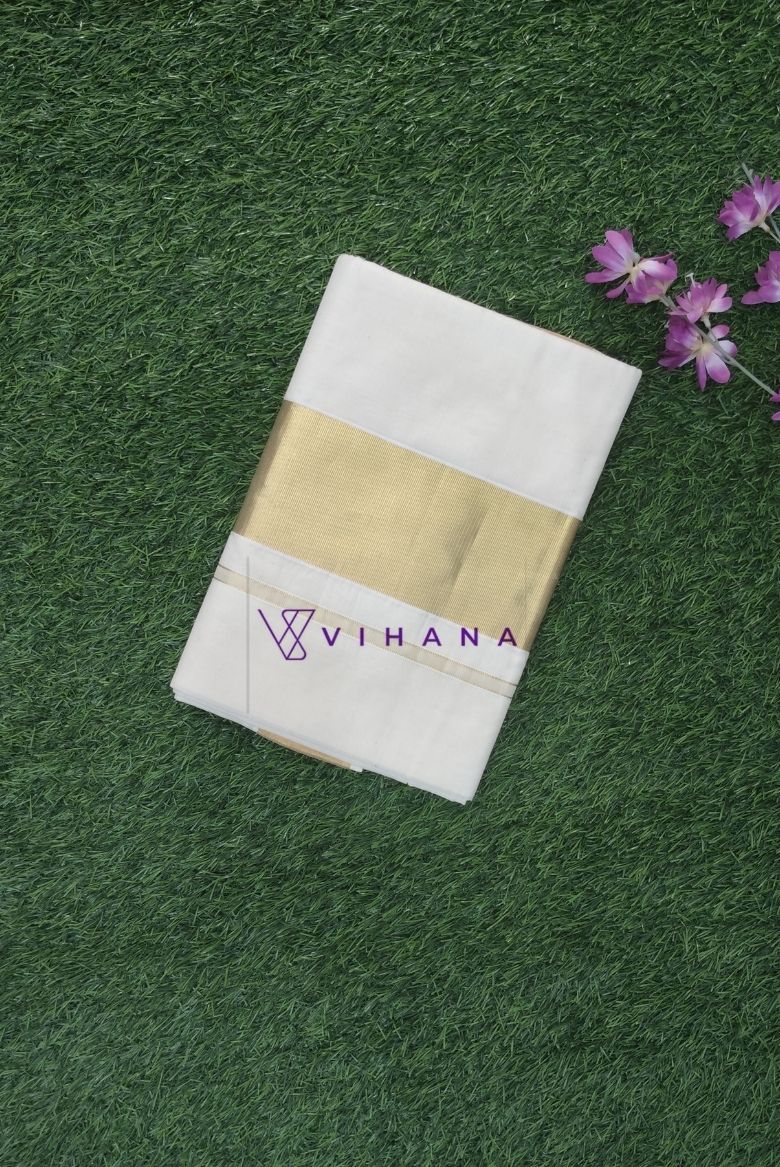 This saree is a traditional Kerala Kasavu style from Vihana, featuring a pristine white body paired with a prominent golden border.