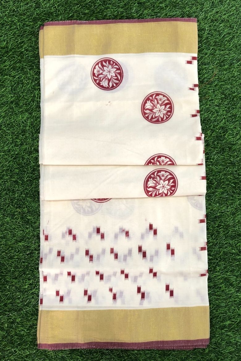 Kerala Cotton Set Saree with Maroon Floral and Geometric Prints