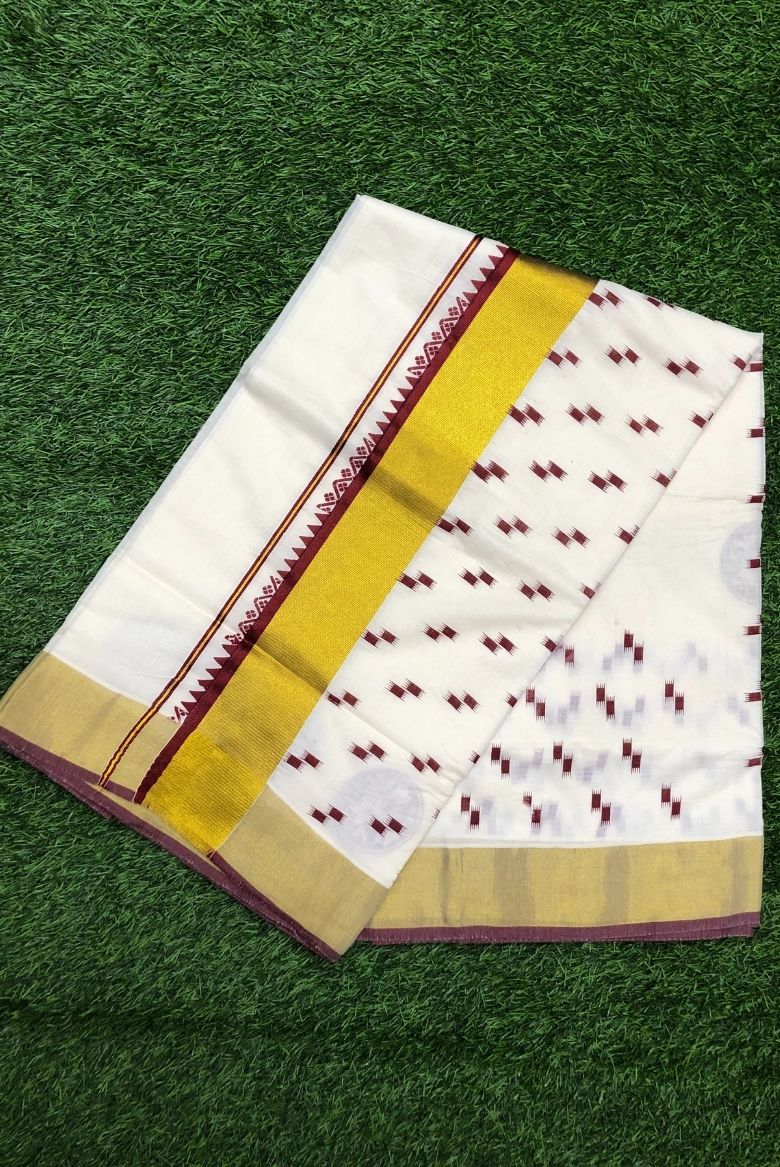 The body of the fabric is adorned with small, repetitive maroon motifs, likely an ikat or block-printed pattern and also floral motifs. This saree features a prominent golden zari border (kasavu) along with a thick band of solid maroon. The pallu of the maroon band displays a traditional, intricate zigzag or temple design pattern.