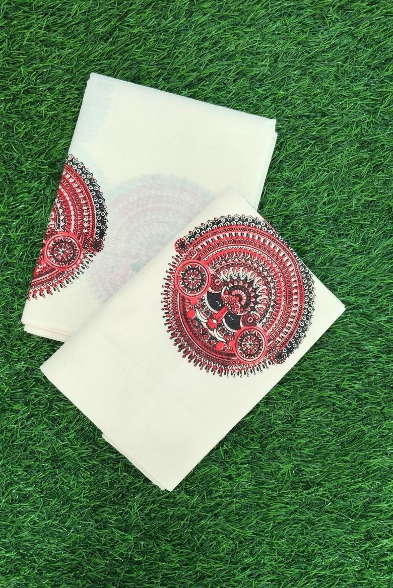 This cotton set mundu is a traditional Kerala attire featuring a striking Theyyam inspired circular motifs in bold red and black.