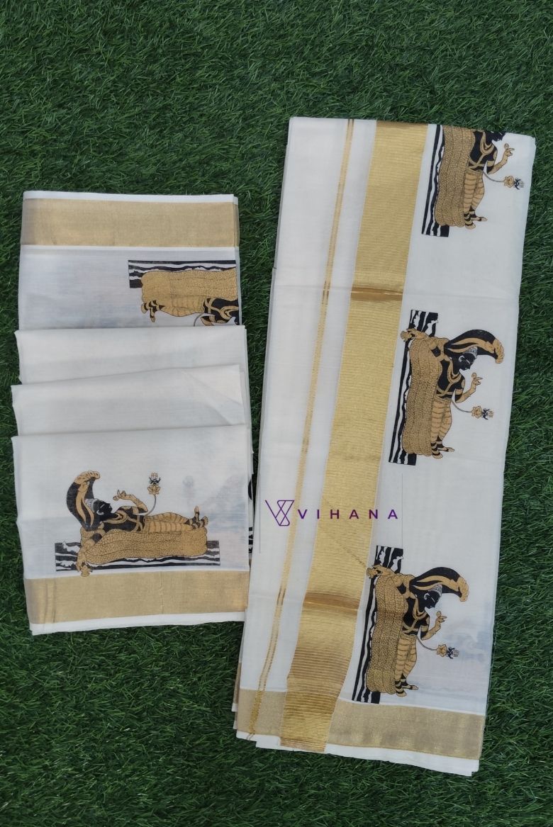 Kerala Traditional Kasavu Set Mundu with Classic Lord Mahavishnu Prints