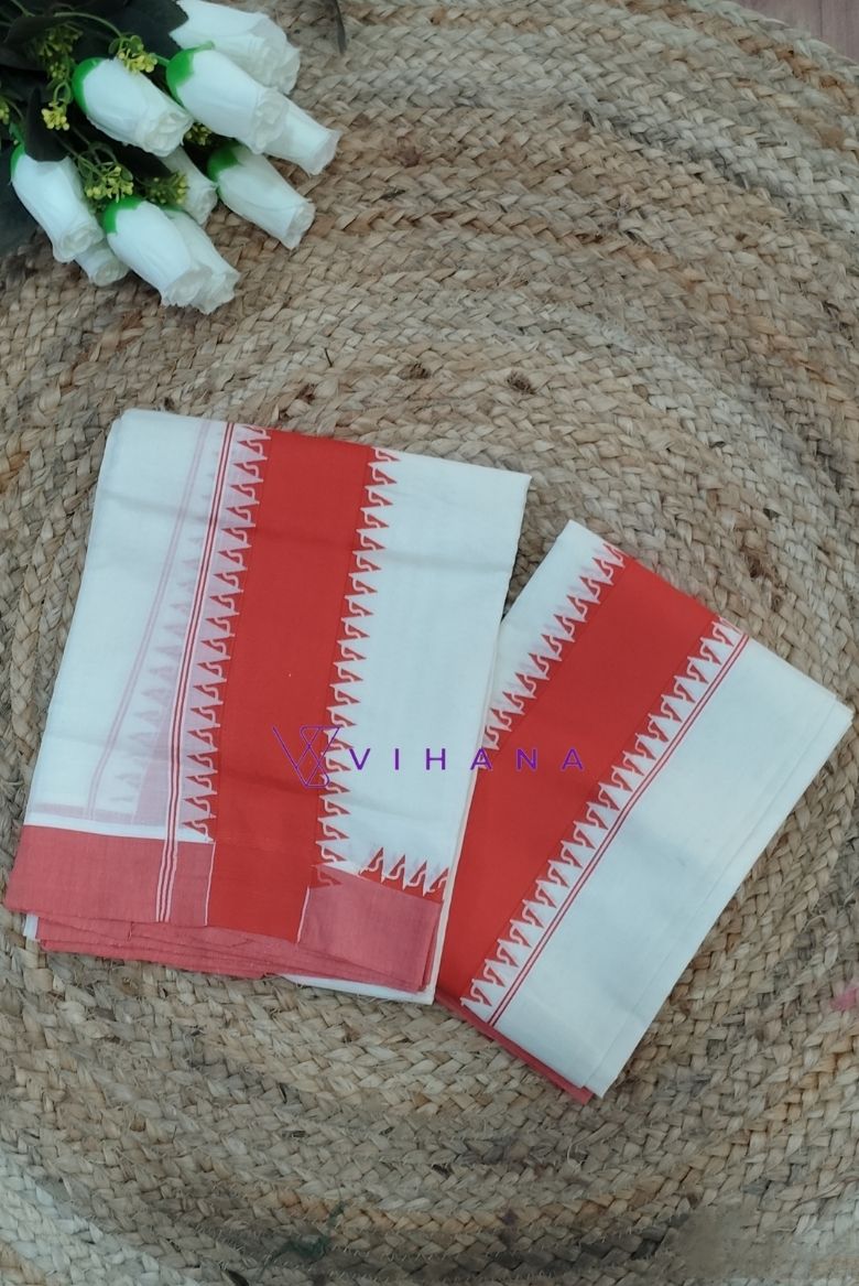 This Kerala Cotton Set Mundu features a classic off-white enhanced with a rich red orange & temple border design.