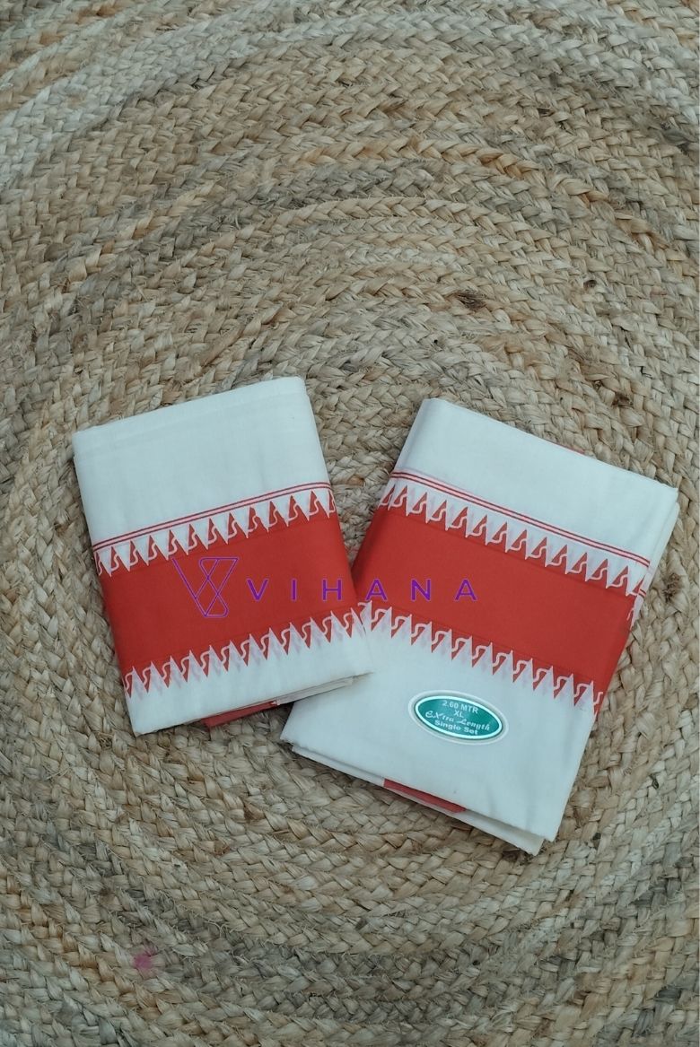 Kerala Traditional Red Orange Cotton Set Mundu