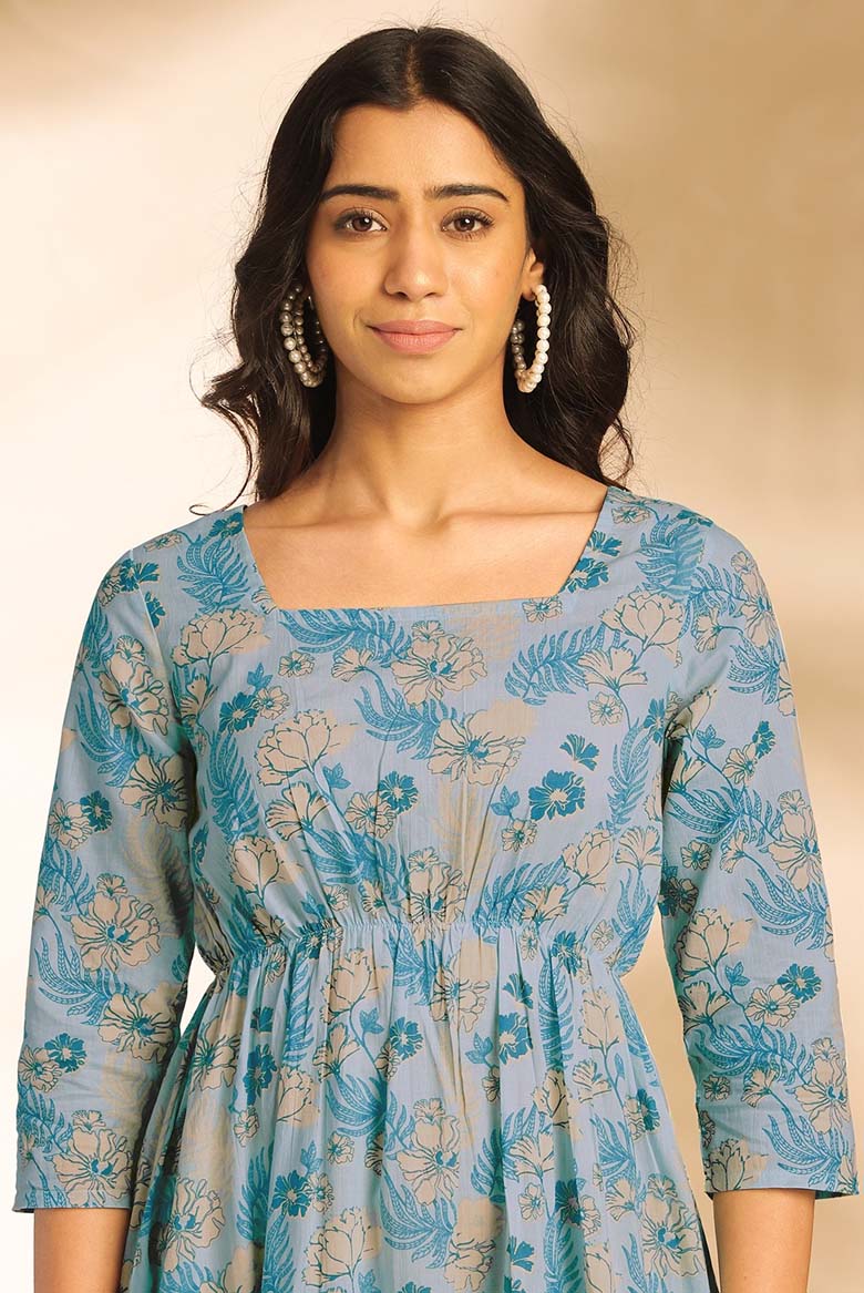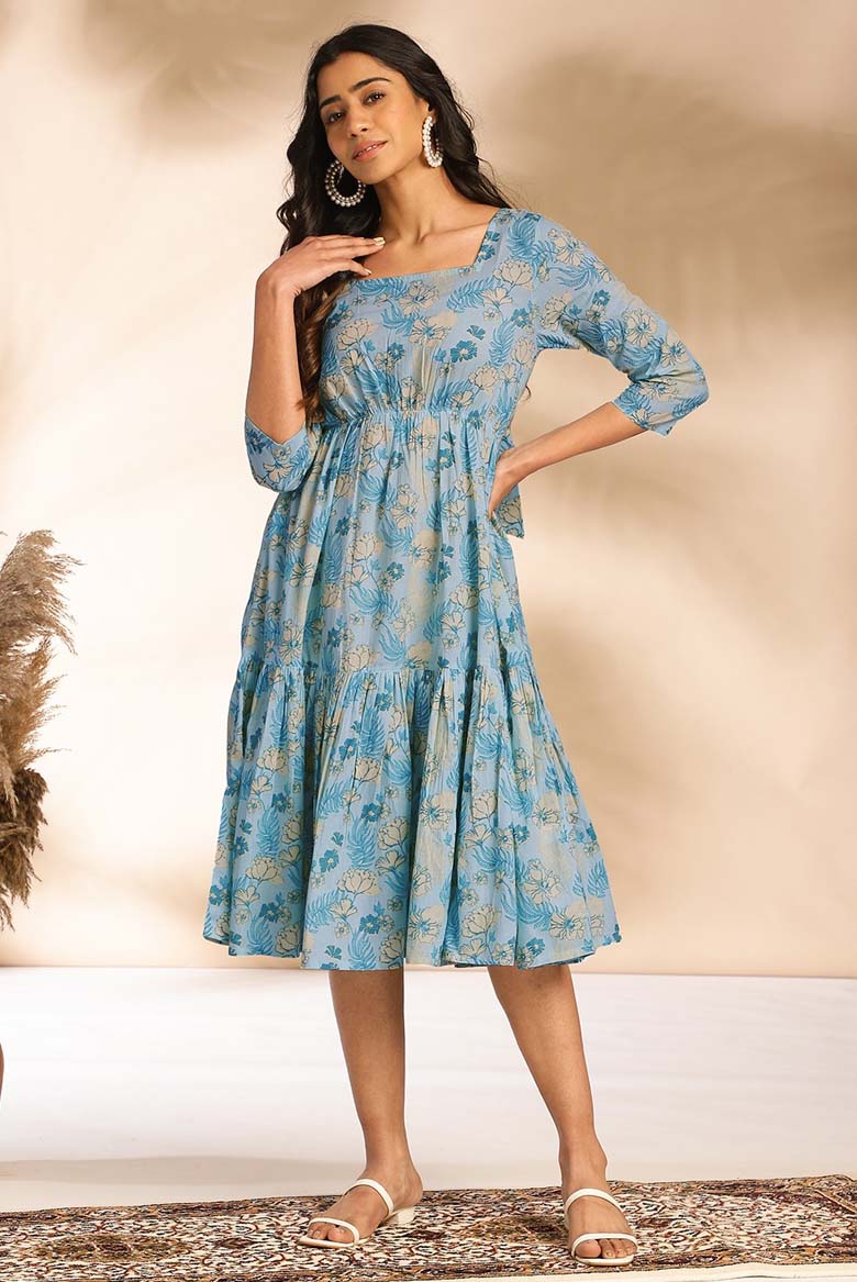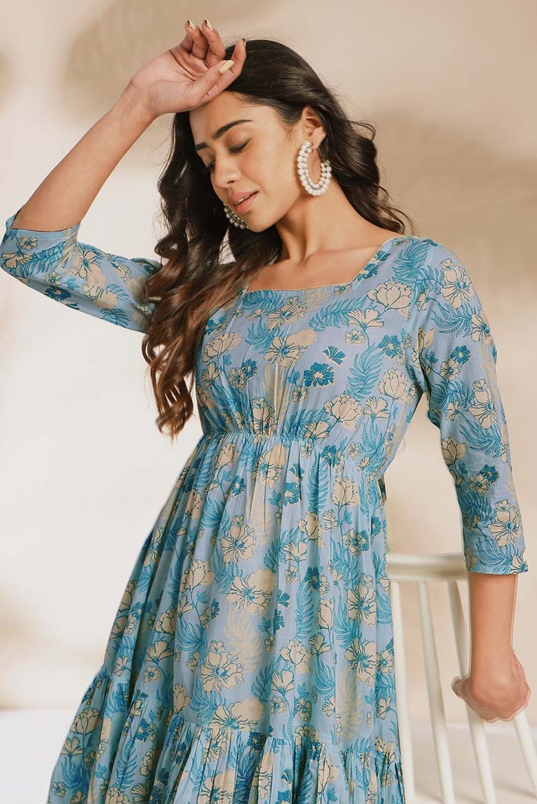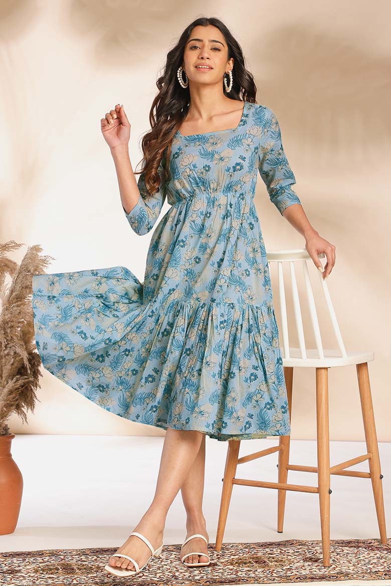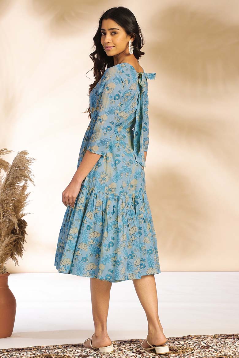 Enhance your modern wardrobe with this floral fit-and flare dress . The rich light blue back-tie-up dress will elevate your casual mood for any occasion. Enhance your style with fusion dresses with minimal and intricate details perfect for all your summer needs. Adore it with some minimal jewelry.