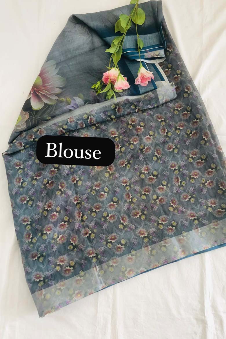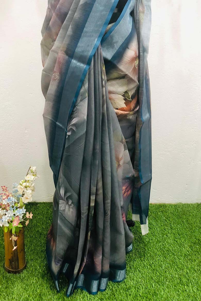 Linen-cotton blend saree with a 3D digital print, comes with an unstitched running blouse piece. (Color-Grey)
