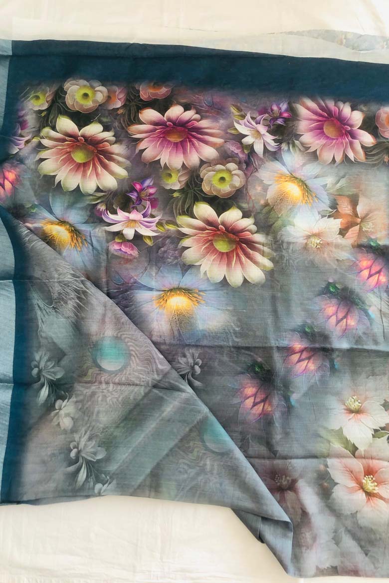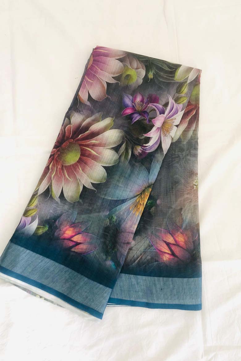 A Linen-cotton blend saree with a 3D digital print, comes with an unstitched running blouse piece.”