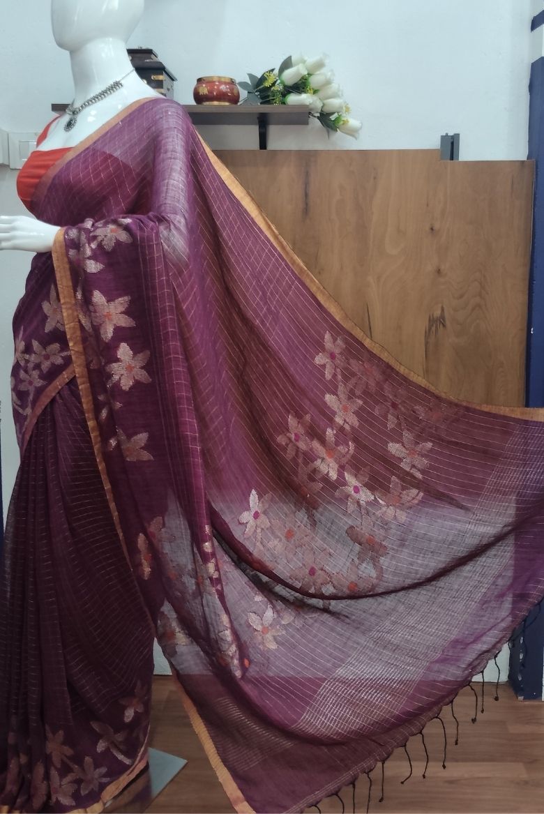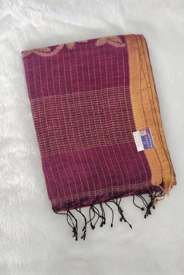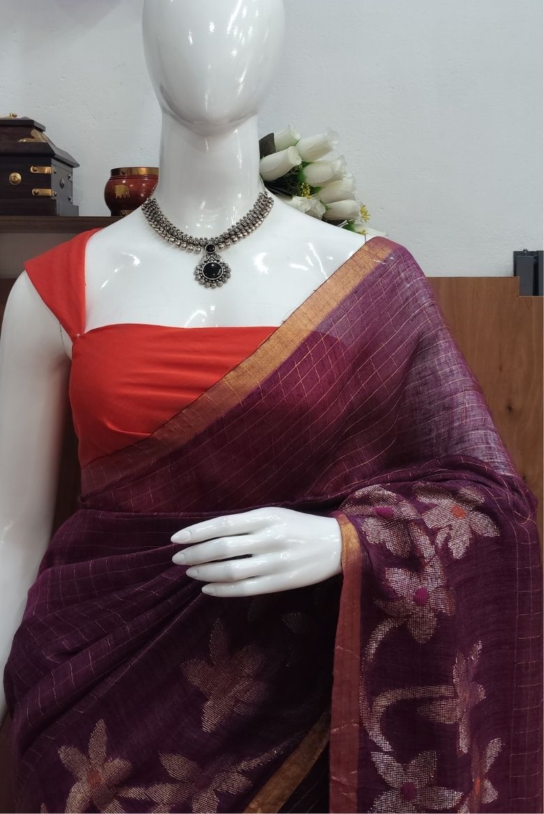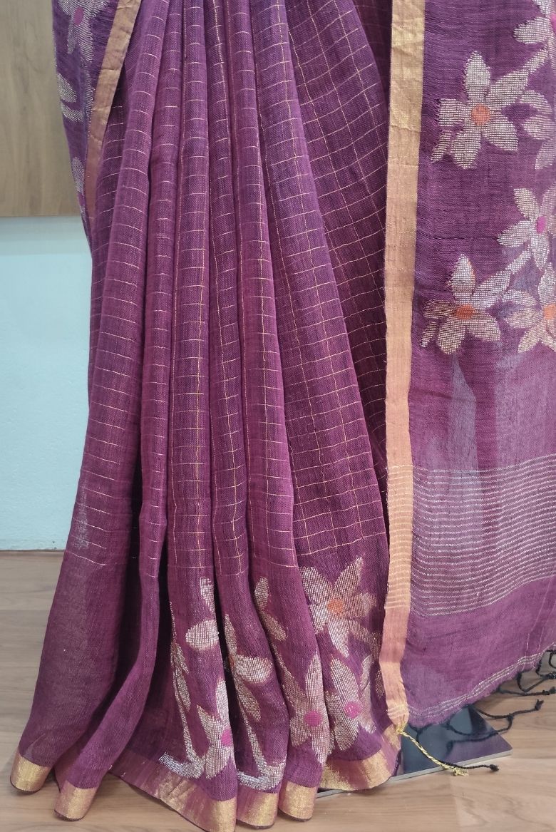 This Magenta rich Jamdhani weave saree featuring golden zari work and floral motifs . The body of the saree is check and lustrous , which highlights the intricately woven Jamdhani flowers running vertically along the Pallu ends in a broader gold zari panel with tassels and borders are in antique gold zari.