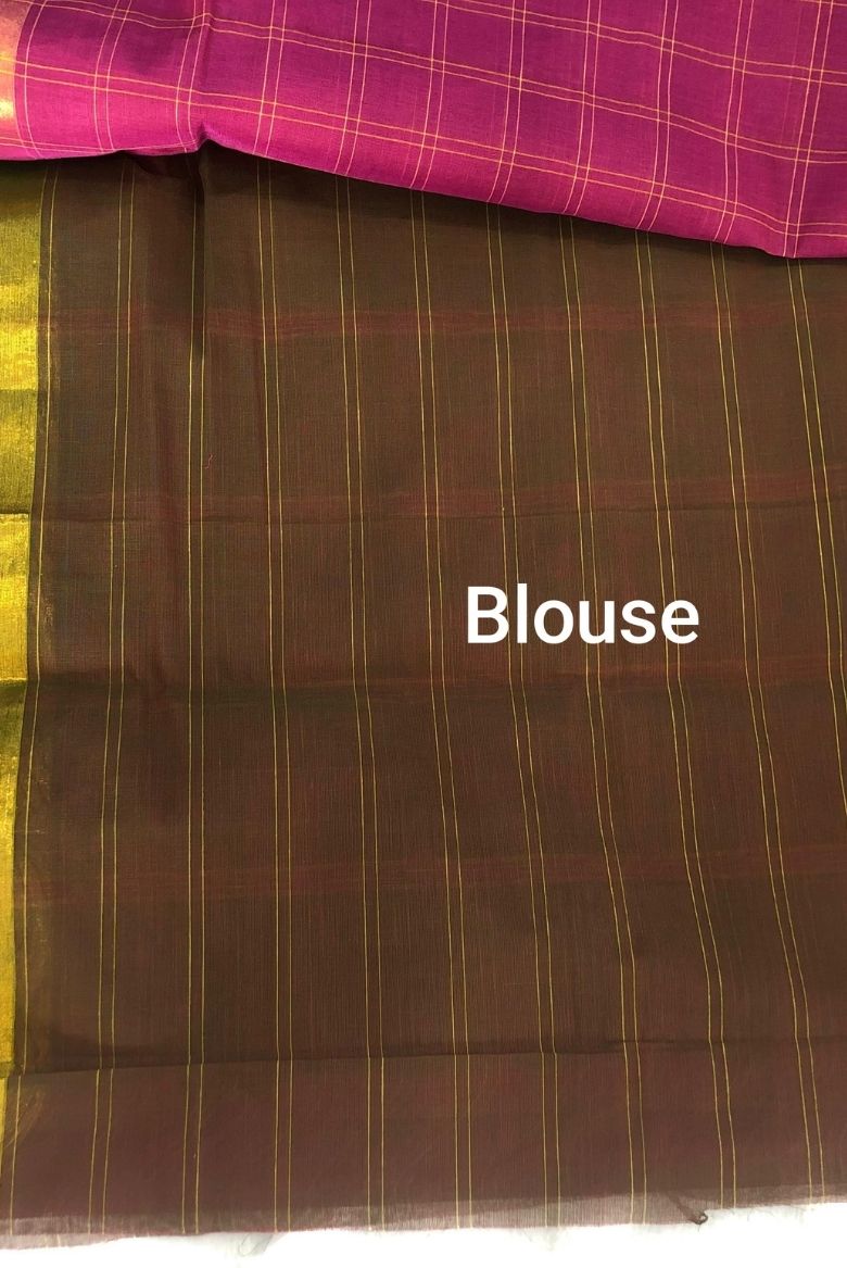 The Magenta saree features a distinct Yellow checkered pattern , has horizontal stripes with gold zari along the contrasting Green borders and Pallu.