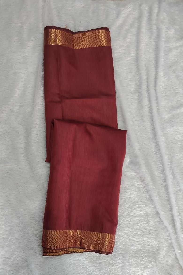 This saree features a rich Maroon body with a prominent wide golden zari border . The Pallu is highlighted with that same Golden zari stripe designs.