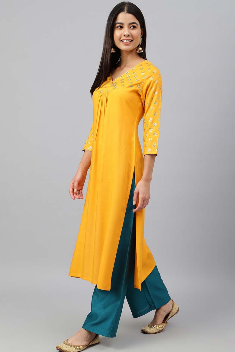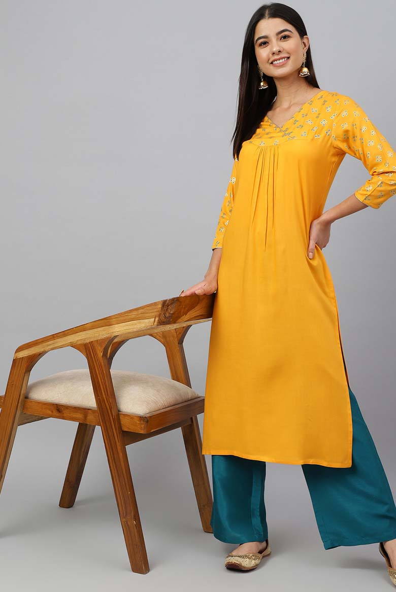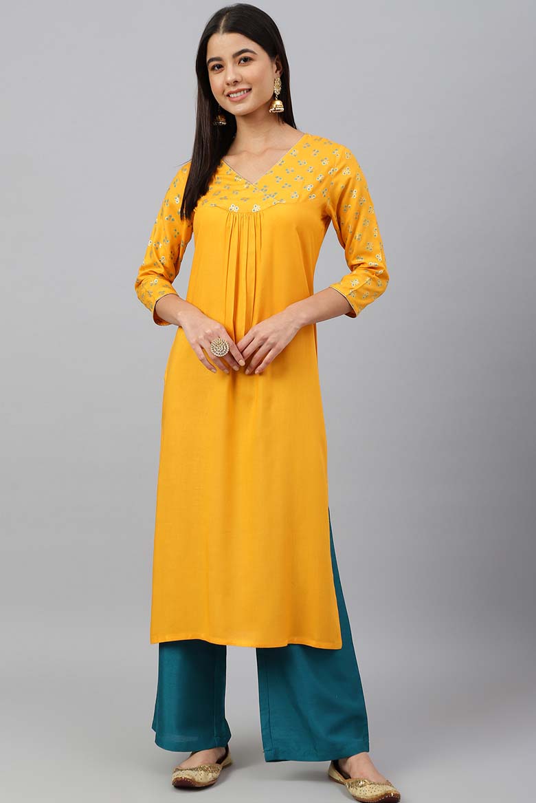 Give your everyday fashion a twist with this orange rayon foil print angrakha kurta. It features v-neck with angrakha style , 3/4sleeves, prints on yoke and sleeves with golden piping.