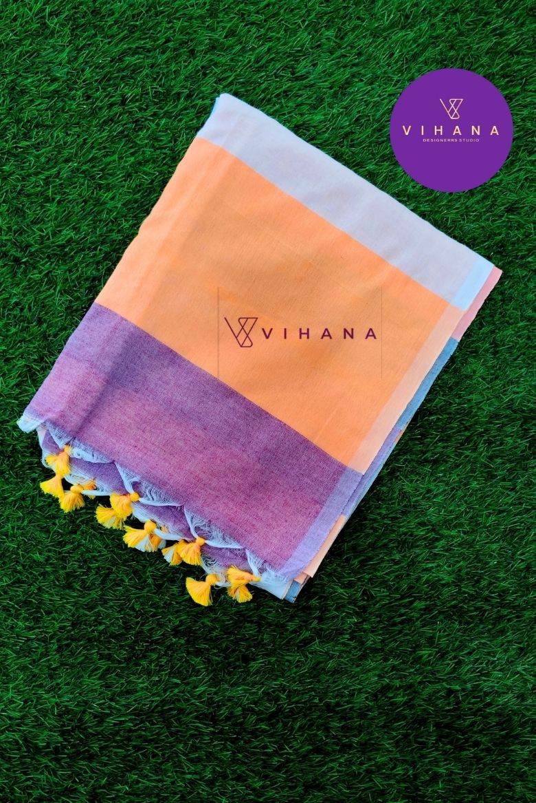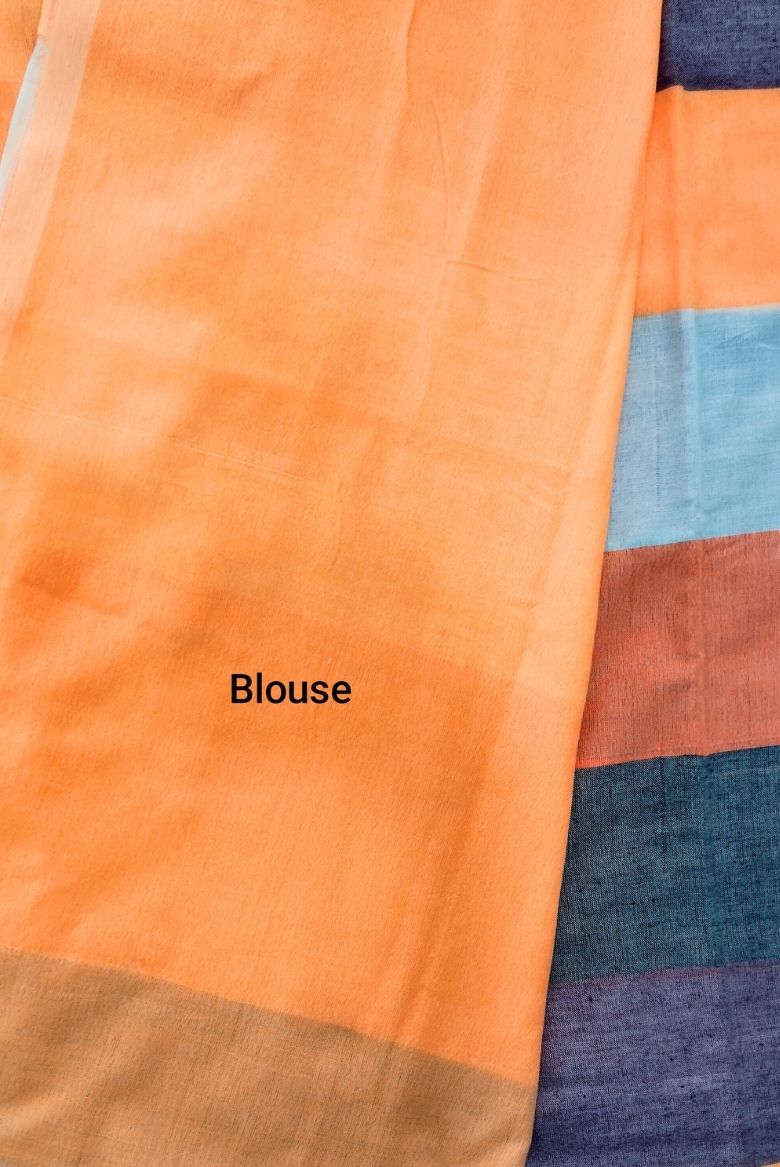 This elegant saree features a soothing blend of pastel shades in a modern block pattern. The graceful combination of orange, soft peach, muted lavender, subtle grey, and warm cream creates a calm yet stylish look. The broad horizontal panels add a contemporary touch while maintaining a timeless charm.