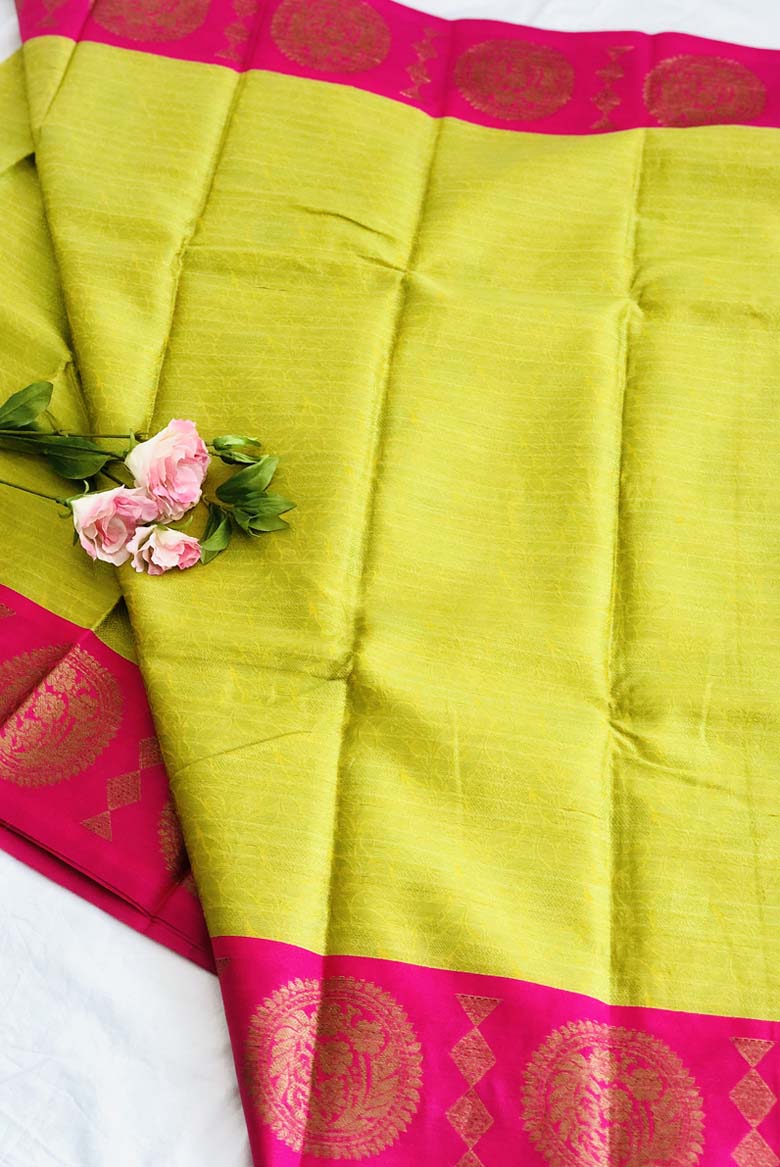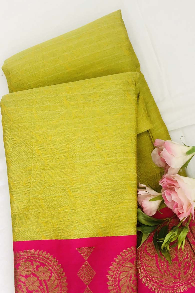 A Parrot Green Banarasi Silk Saree with Woven Floral Designs and a Contrast Pink Designer Zari Border, including an Unstitched Blouse Piece.