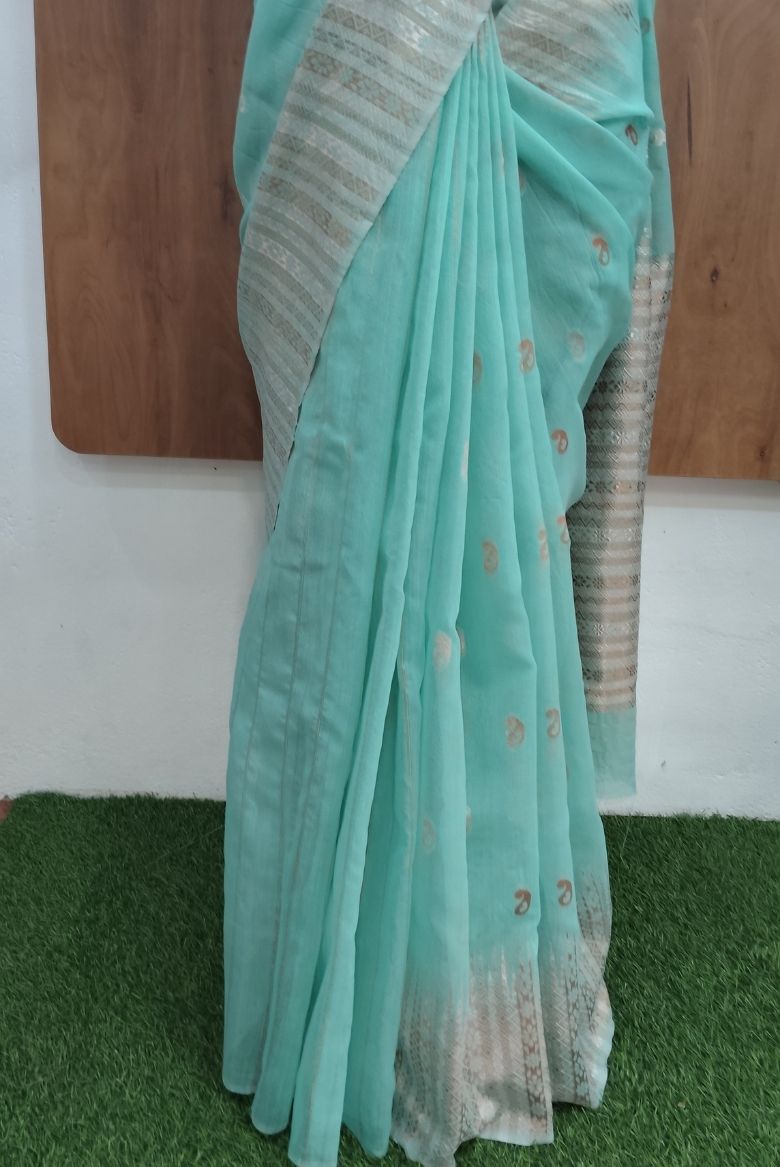 The pastel blue Cotton Linen with paisley motifs allover the body , enhancing floral striped borders .The Pallu is highlighted with golden & copper zari striped floral woven designs.