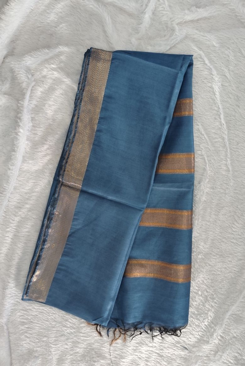 This saree features a rich pastel blue body with a prominent wide golden zari border . The Pallu is highlighted with that same Golden zari stripe designs.