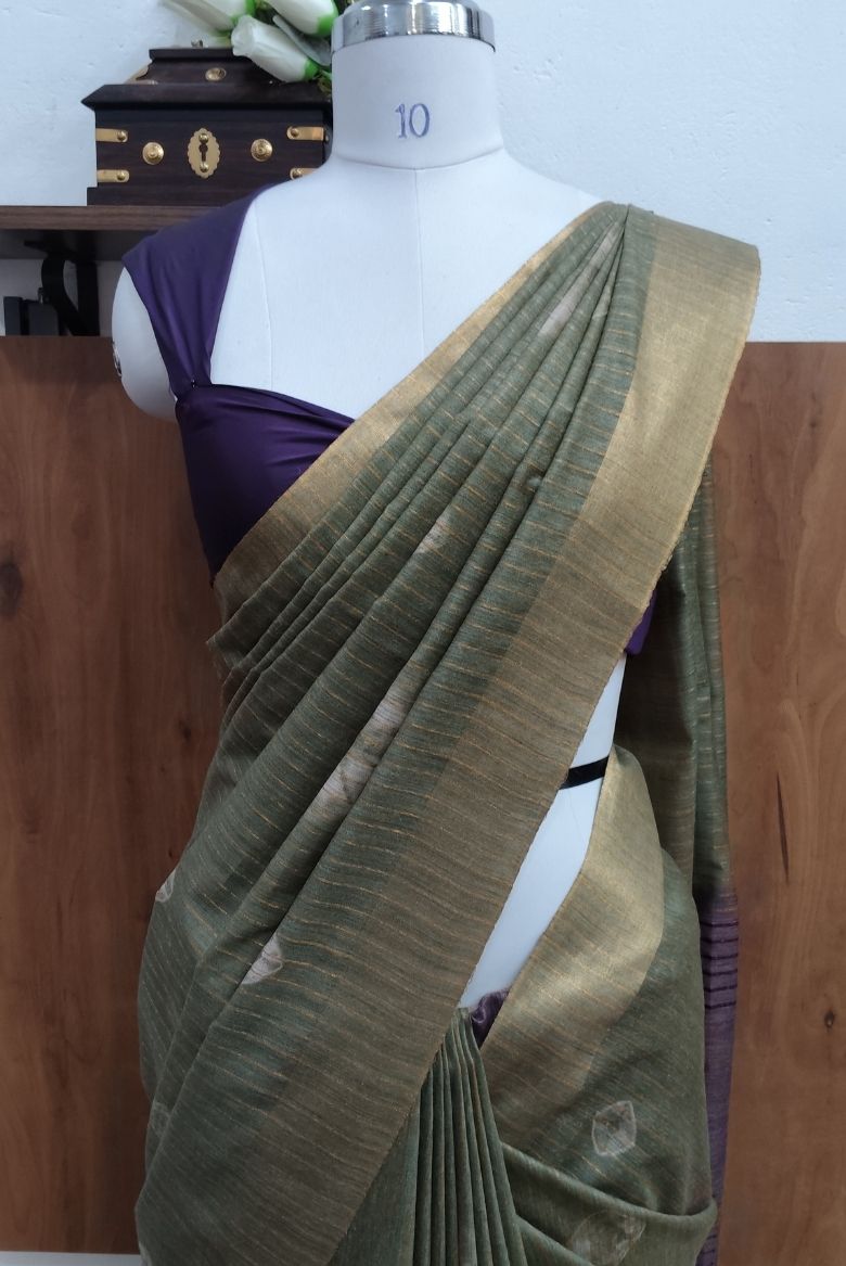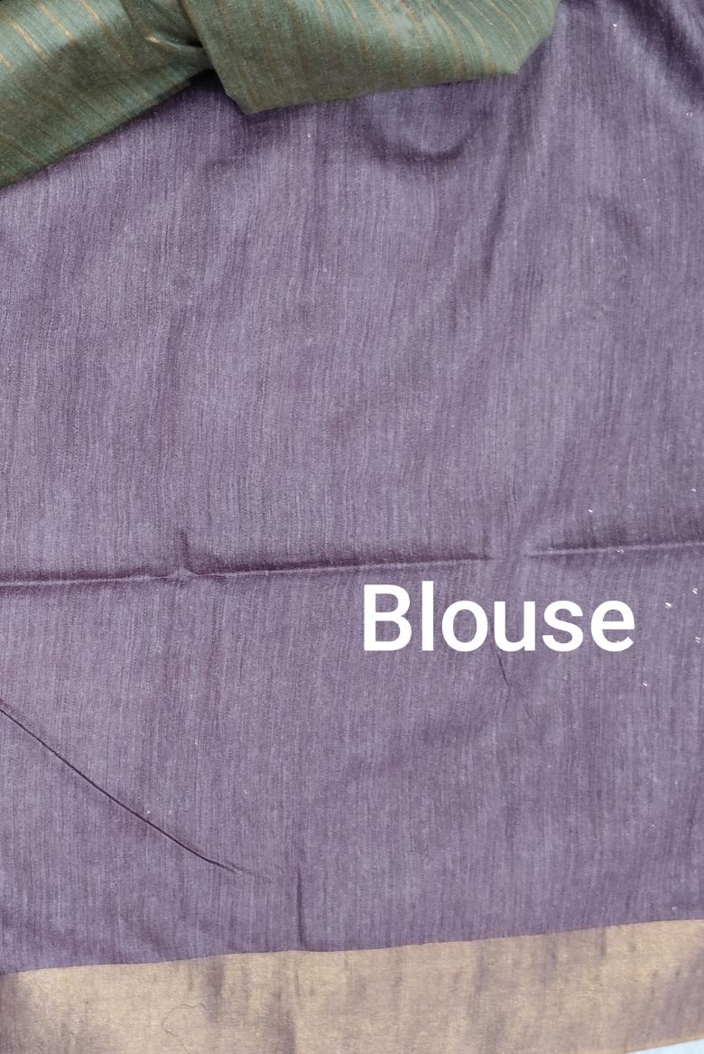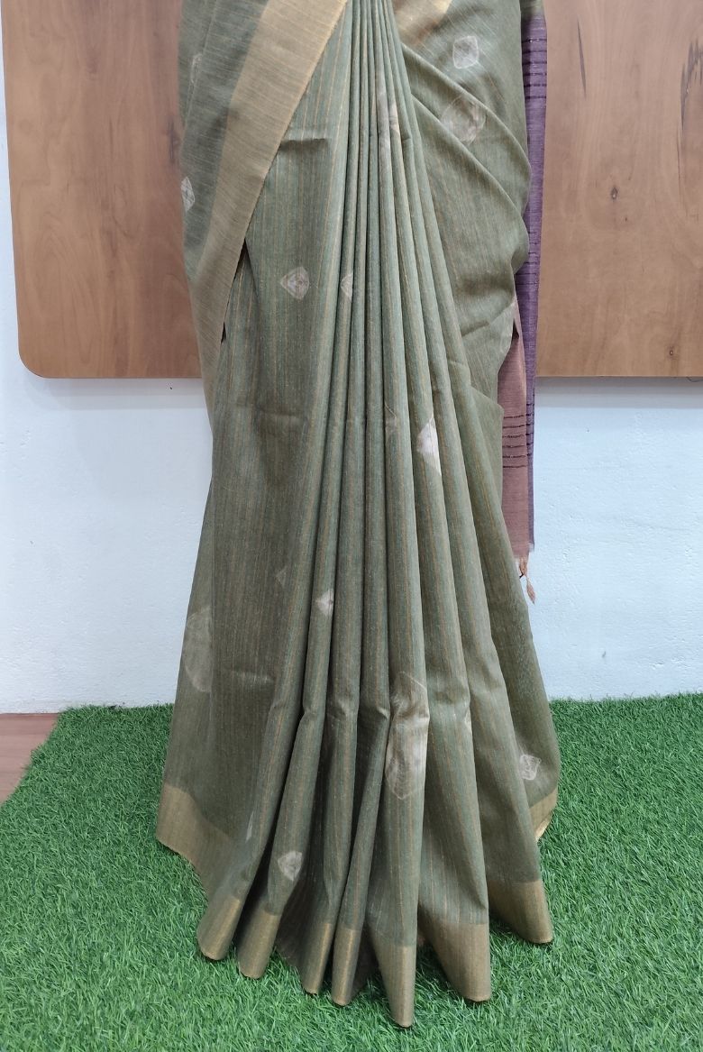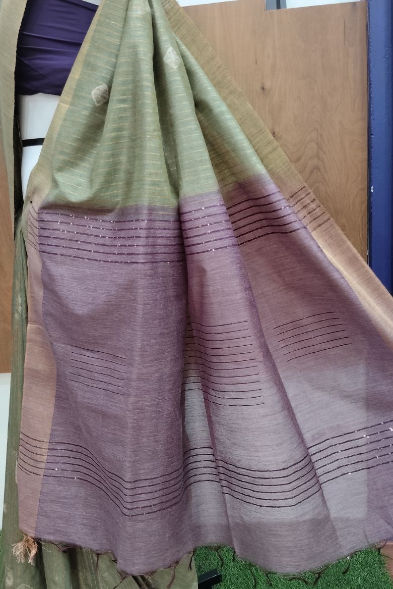 This is a Bhagalpuri Silk Saree in a muted Pastel Green tone with subtle Bhandini motifs . The Pallu in a Dusty Mouve shade with horizontal stripes and a golden zari edge borders.