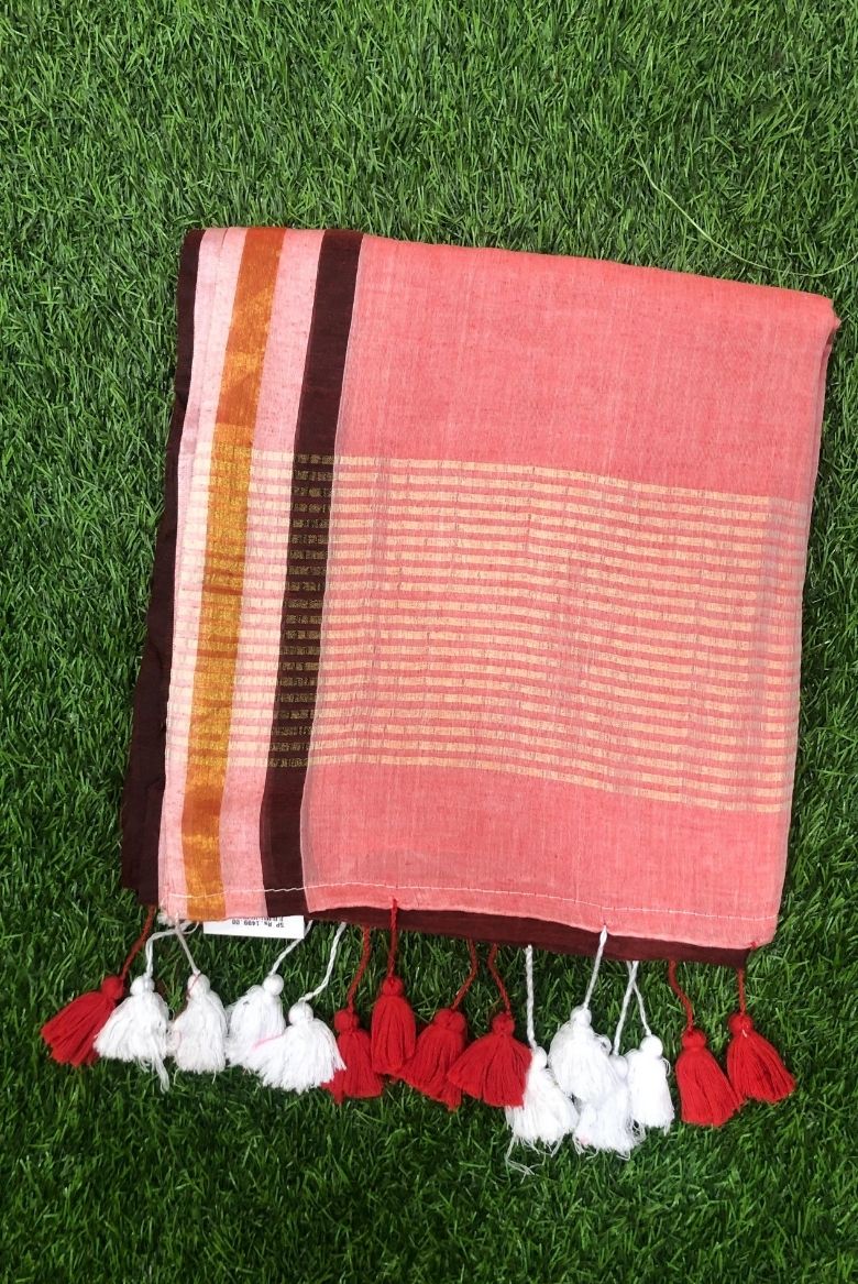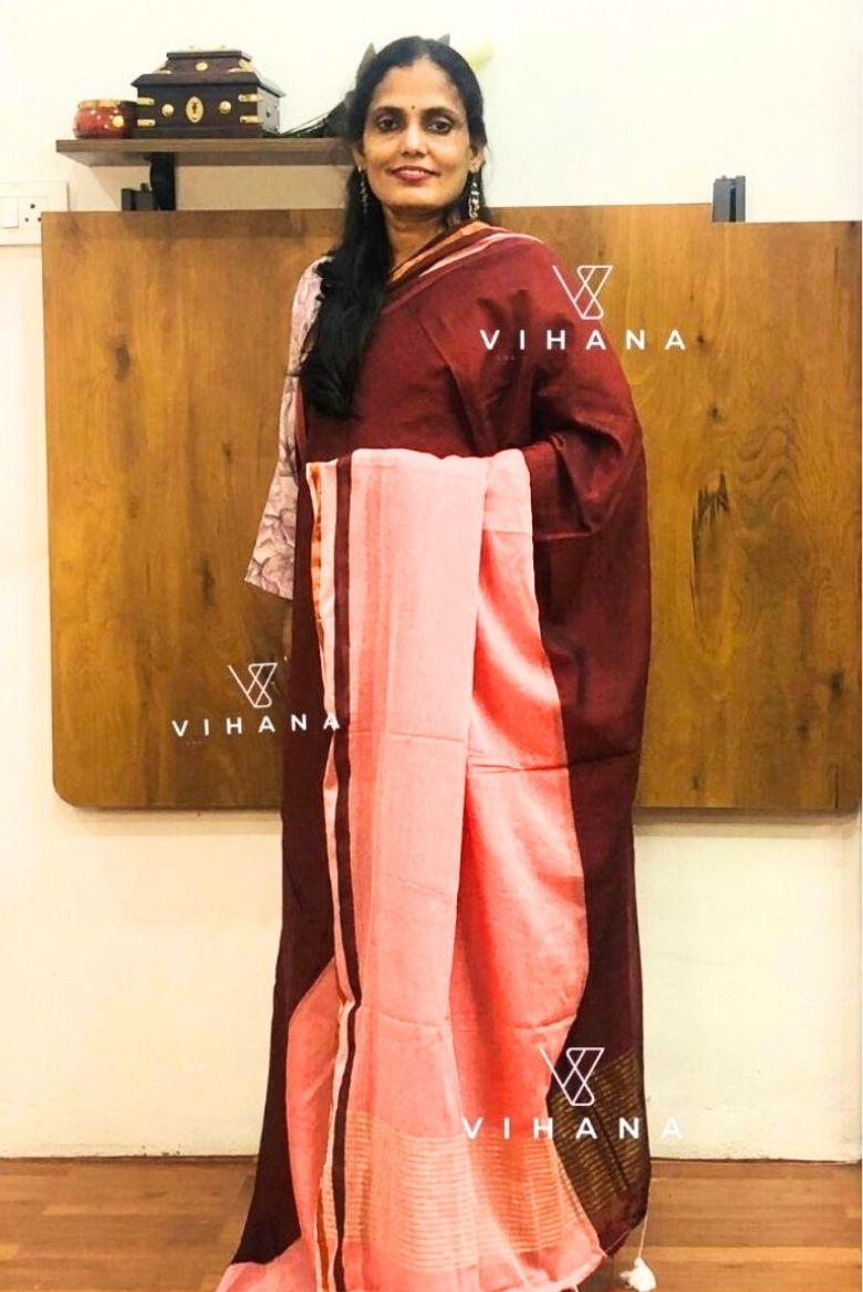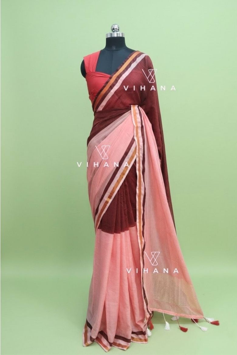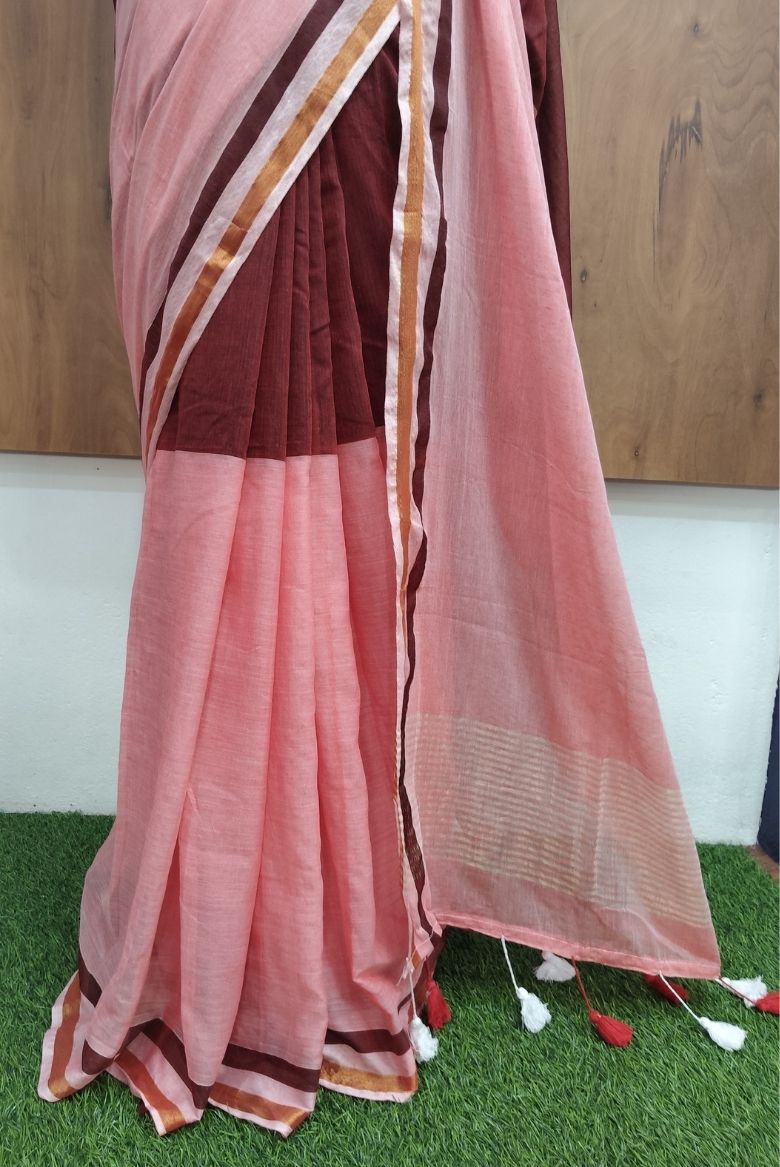 A soft and lightweight Mul-cotton saree in a dual tone palette of deep maroon and blush pink , featuring bold diagonal stripes on the Pallu.
