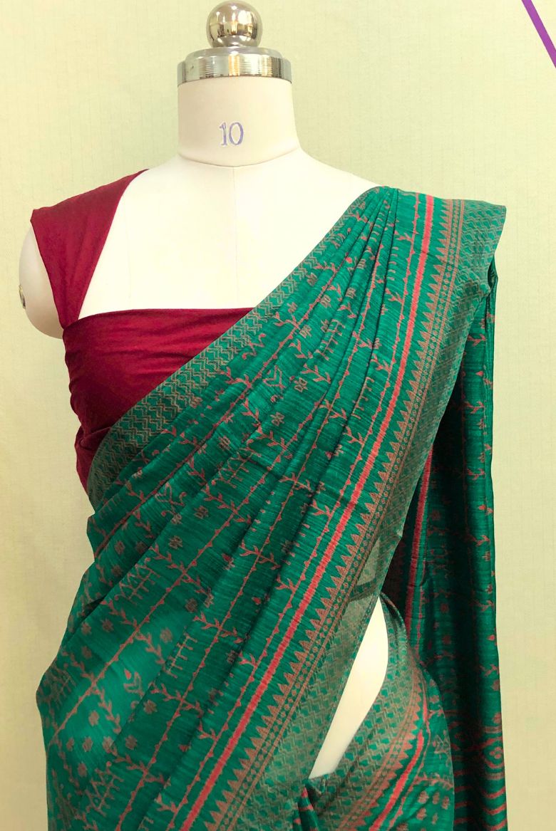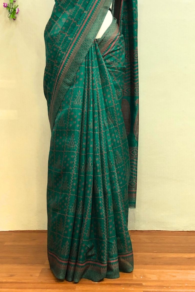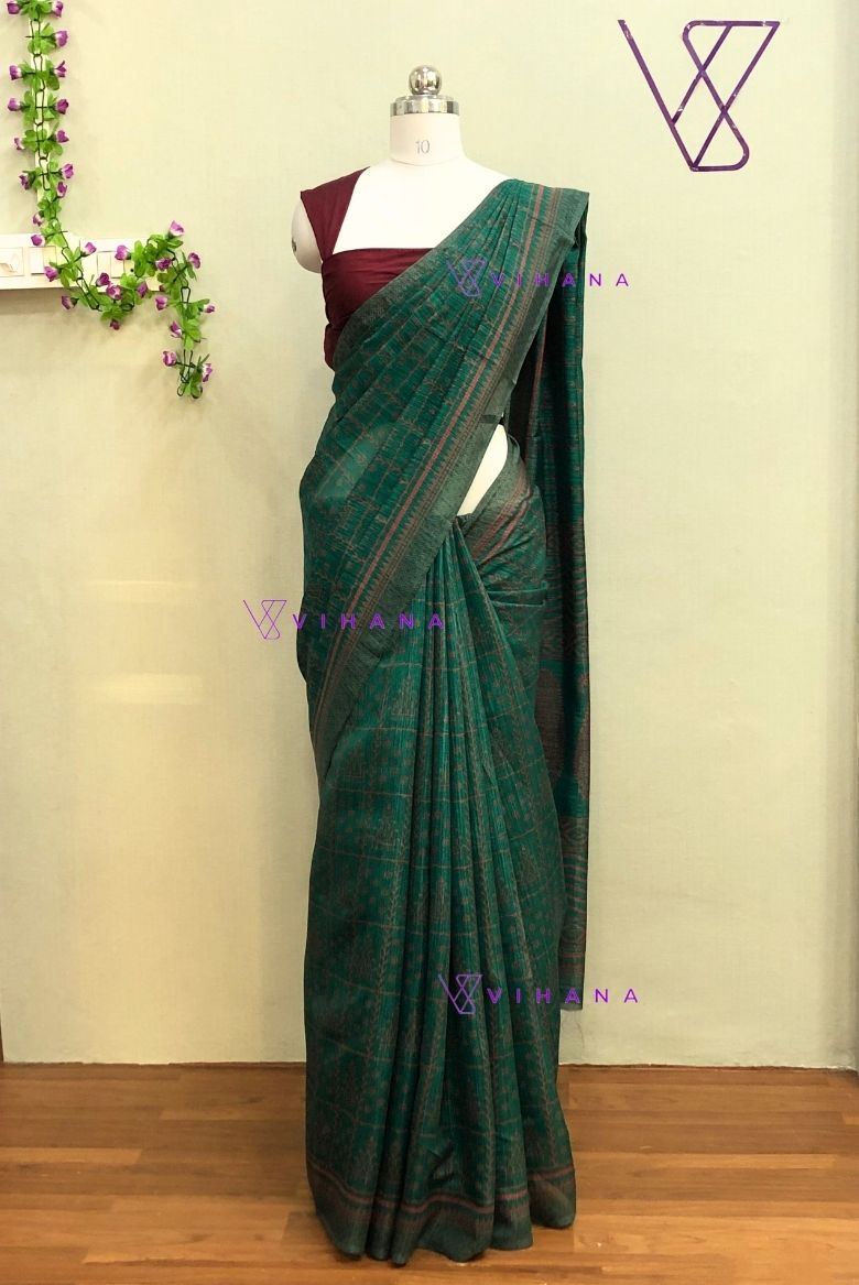 This beautiful saree is crafted from a comfortable and soft cotton-silk blend fabric, perfect for a soothing touch against the skin. It features a subtle checked or printed pattern throughout the body. The primary color is a rich peacock green, complemented by a maroon or reddish border and pallu details.