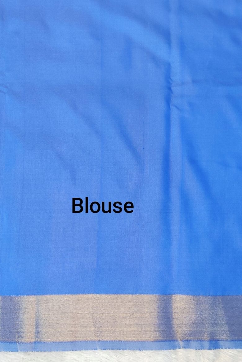 This saree features intricate floral patterns using gold or silver zari threads, golden zari borders, and Pallu is highlighted with contrasting Blue color.