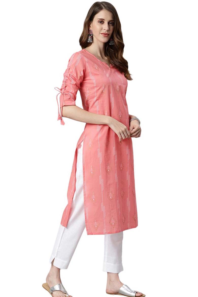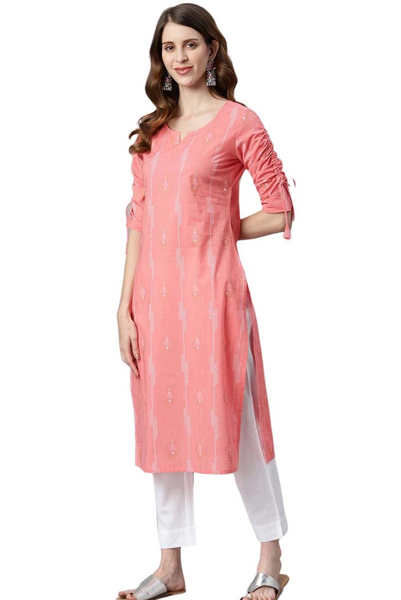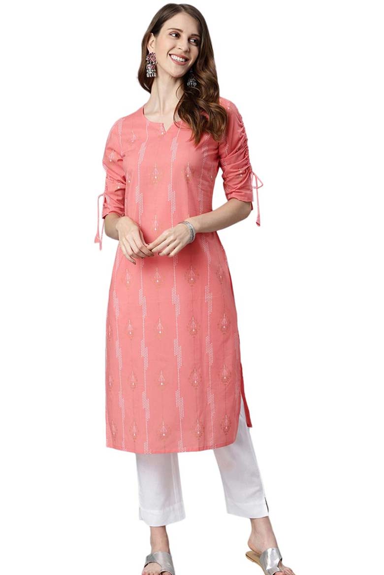 Stamp your sense of style amongst your peers with this elegant pink round neck kurta . Crafted in fine cotton for softness, comfort and drape, it’s print pattern and straight shape makes it an apt choice for important occasions. Pair it with palazzos for a stylish ensemble.
