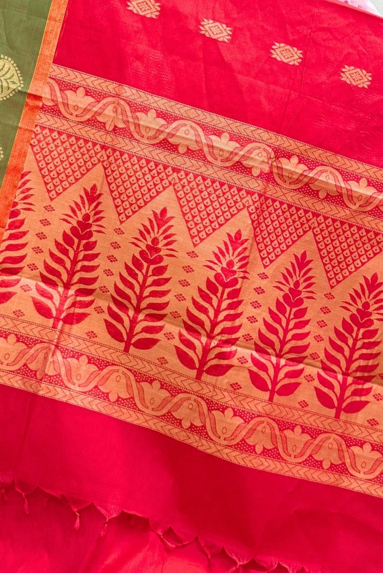 The body of the saree is a Pinkish Red, while the border having Paisley designs and a significant portion of the pallu are olive green. The saree features woven geometric and floral motifs throughout, particularly dense on the lower part and Pallu.