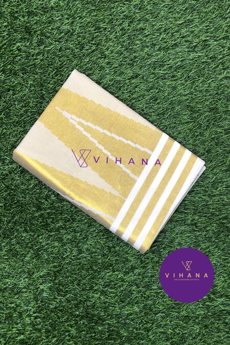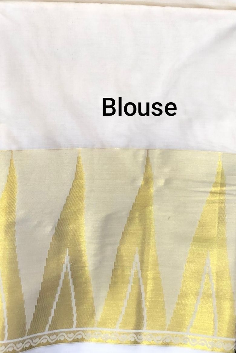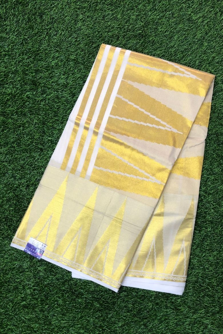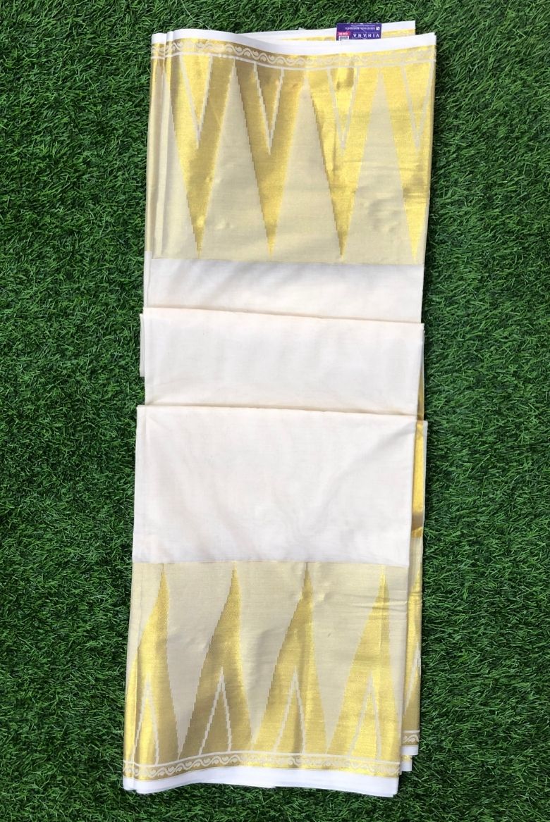 Features a pristine off-white color. The set saree is adorned with a rich golden zari border and pallu, embodying simplicity and sophistication. The border has a distinctive temple border or triangular pattern.